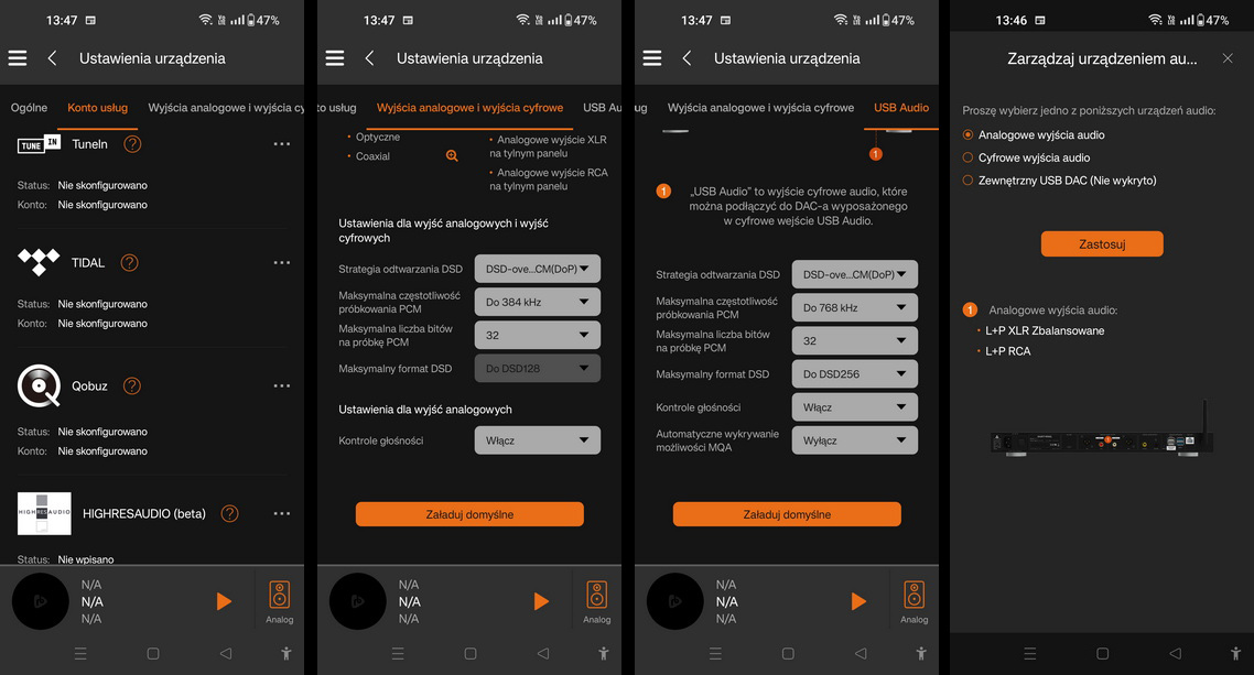 Producent na swojej stronie nie podaje zbyt wielu informacji o możliwościach testowanego urządzenia. By dowiedzieć się, co potrafi, trzeba sięgnąć do aplikacji. Tam okazuje się, że odtwarzanie DSD przez wyjście USB (maks. DSD256) odbywa się w trybie DoP, ale możliwa jest również konwersja plików w tym formacie do PCM. Maksymalna częstotliwość próbkowania dla PCM (dla wyjścia USB) wynosi 786 kHz, a długość słowa to 32 bity. Urządzenie wyposażone jest również w cyfrową regulację głośności. Można ją całkowicie wyłączyć niezależnie dla wyjść cyfrowych i analogowych. Dzięki niej SL1P może pracować bezpośrednio z końcówką mocy, albo aktywnymi kolumnami. Możliwe jest więc zbudowanie minimalistycznego systemu, w którym podłączamy SL1P do sieci z jednej strony, a do aktywnych kolumn z drugiej i niczego więcej nie potrzeba, by odtwarzać muzykę z plików. W ustawieniach dostępnych w aplikacji wybieramy, z których wyjść chcemy korzystać, z czego wynika, że albo korzystamy z analogowych, albo cyfrowych, albo USB. W tejże aplikacji wpisujemy również dane do logowania do serwisów streamingowych, do których mamy wykupiony dostęp. W zakładce ‘Radio internetowe’ dostępnych z kolei są setki stacji oferujących różne rodzaje muzyki i różną jakość streamów. Słowem, poza Bluetoothem (ale „apple’owcy” mogą korzystać z Airplay2), Bremen SL1P oferuje właściwie wszystko, czego od odtwarzaczy sieciowych wymaga większość użytkowników. ▓ ODSŁUCH JAK SŁUCHALIŚMY • Odtwarzacz plików Silent Angel Bremen SL1 P był testowany w moim systemie referencyjnym. Na początku założyłem sobie sprawdzenie go na trzy sposoby: