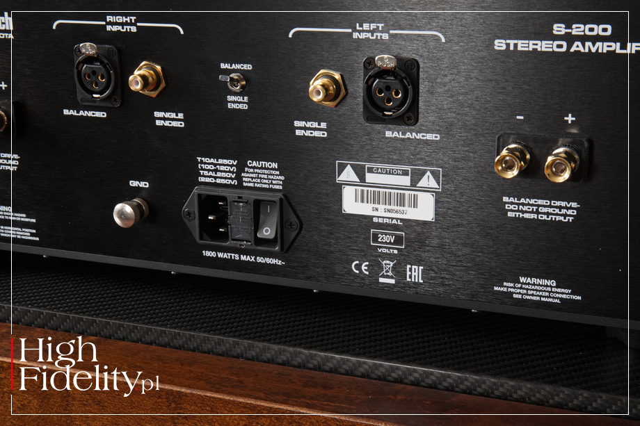 Urządzenie ma wysoką moc – 200 watów na kanał (stąd jego nazwa – S-200) przy obciążeniu 8 i aż 400 przy 4 Ω. Ma dwa rodzaje wejść – zbalansowane i niezbalansowane. Wydaje się, że jego sekcja wejściowa ma budowę symetryczną. Wybieramy między nimi niewielkim przełącznikiem hebelkowym. Wyjścia głośnikowe są pojedyncze i naprawdę solidne; wyglądają jak produkt firmy Cardas. Wszystkie gniazda liniowe są złocone i pochodzą, jak się wydaje, od Neutrika.
