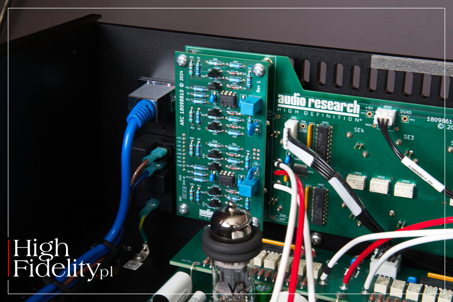LS-2 oferuje sześć wejść liniowych, z czego dwa są wejściami zbalansowanymi XLR, a trzy niezbalansowanymi RCA. Pamiętajmy o tym, że ARC umieszcza gniazda odwrotnie – lewy kanał jest na górze, a prawy na dole. Mamy też do dyspozycji dwie pary wyjść liniowych, ponownie na XLR i RCA. LS-2 ma budowę niezbalansowaną, wejścia XLR są więc traktowane jak wejścia niezbalansowane, natomiast przed wyjściem XLR jest półprzewodnikowy symetryzator. Obok znajdziemy gniazdo USB, ale nie dla sygnału audio, a dla nowego oprogramowania sterowania, jeśli będzie dostępne. LS-2 jest lampową konstrukcją pracującą w klasie A bez sprzężenia zwrotnego; lampową, ale z zasilaczem półprzewodnikowym. I nie do końca „czysto lampową”, przynajmniej kiedy będziemy korzystali z wyjścia XLR – wówczas będziemy mówili o budowie hybrydowej. W sercu urządzenia znajdują się dwie lampy Sovtek 6H30Pi – sporej wielkości podwójne triody, które znajdziemy również, dla przykładu, w odtwarzaczach CD firmy Ancient Audio, BAT i Ayon Audio. Swego czasu mówiono o nich „superlampy” ze względu na osiągi, w tym możliwości prądowe. FUNKCJONALNOŚĆ • Choć mowa o klasycznym przedwzmacniaczu, ma on całkiem spore możliwości funkcjonalne. Możemy nim sterować za pomocą gałek na przedniej ściance, dotykowego wyświetlacza lub z pilota zdalnego sterowania. Użytkownik ma z nim łatwe życie, a to dzięki dużemu, siedmiocalowemu wyświetlaczowi LCD. Dużymi cyframi jest na nim pokazywana siłą głosu, a obok wyświetlane jest aktywne wejście. Pod spodem mamy wyświetlone nazwy przyciszenia, mute oraz mono/stereo. W lewym dolnym rogu umieszczono ikonkę menu. A tam ustalimy czy wejście ma być mono czy stereo, albo czy ma być „przelotką” dla systemu kina domowego (procesora AV). Zmienimy też jasność wyświetlacza i ustalimy jeszcze jaki ma mieć kolor; ja wybrałem klasyczny dla tego producenta zielony, ale biały też wygląda bardzo dobrze. Wyświetlacz jest dotykowy, nazwy i ikony duże. Ale mamy też dwie klasyczne gałki – jedna to regulacja siły głosu, a druga zmiana wejścia. Ta pierwsza współpracuje nie z klasycznym potencjometrem oporowym czy drabinką scaloną, a dyskretną drabinką wykonaną na precyzyjnych opornikach Dale przełączanych przekaźnikami. Dlatego przy przekręcaniu gałki wewnątrz urządzenia słychać ciche kliknięcia. Wzorem innych producentów, na myśl przychodzi mi od razu Accuphase, ale nie tylko, LS-2 umożliwia dokupienie dodatkowych „kart”: przedwzmacniacza gramofonowego MM/MC i/lub przetwornika cyfrowo-analogowego. Wsuwa się je samodzielnie w sloty na tylnej ściance, a na wyświetlaczu pojawiają się wówczas dodatkowe opcje. Wejście gramofonowe obsługuje wkładki Moving Magnet (MM) i Moving Coil (MC), oferując wzmocnienie, odpowiednio, 42 i 62 dB. Nie mamy możliwości zmiany parametrów obciążenia. DAC dodaje do tego trzy wejścia: optyczne, koaksjalne RCA oraz USB. Nie dostaniemy jednak informacji o sygnale wejściowym. Każda z kart kosztuje 5200 złotych, czyli – jak na warunki high-endu – znośnie. TECHNIKA • Nowe urządzenia firmy ARC są zbudowane mechanicznie lepiej niż poprzednie. Zamiast giętych blach teraz to są aluminiowe profile, frezy i blachy wsuwane między boczne ścianki, a całość jest lepiej spasowana. Układ elektroniczny LS-2 zmontowano na kilku płytkach drukowanych. Pośrodku jest największa, z układem wzmacniającym. W jego centrum są dwie, dobierane i parowane lampy Sovtek 6H30 typu NOS (ang. New-Old Stock) na które założono obręcze tłumiące drgania. Sprzęgnięcie ze światem zewnętrznym zapewniają duże, nawet bardzo duże, kondensatory polipropylenowe Audiocap X Firmy Reliable Capacitors. Należą one do serii PPFXS, w której zastosowano wielosekcyjny polipropylen i napyloną cyną folię. Jak mówi ich producent, „absorpcja dielektryczna jest bardzo niska, co sprawia, że są one pożądane w systemach o dużej prędkości”. W całym układzie są naprawdę ładne podzespoły bierne, z opornikami Dale, kondensatorami Vishay , Nichicon i Wima na czele. Bardzo dobrze wygląda również zasilacz z transformatorem typu R-core i baterią kondensatorów. Ciekawostka – wiele elementów mechanicznych wewnątrz, jak belki podtrzymując kable, jak klatka dla opcjonalnych kart, wydaje się wykonanych z plastiku na drukarkach 3D. ▓ S-200 WZMACNIACZ MOCY S-200 miał premierę w czerwcu 2025 roku w ramach 55th Anniversary Series, czyli serii przygotowanej z okazji 55. rocznicy wraz z modelami S-100 oraz LS-2 i LS-3. Ma on budowę tranzystorową i pracuje w klasie AB. Przez wiele lat Wiliam Johnson unikał tranzystorów, uważając ich dźwię za „okropny”. Większość jego wzmacniaczy pracowała z lampami 6550 i kT88. Z czasem to się jednak zmieniło. W wywiadzie zamieszczonym w książce Illustrated History of High-End Audio. Volume Two: Electronics mówił: