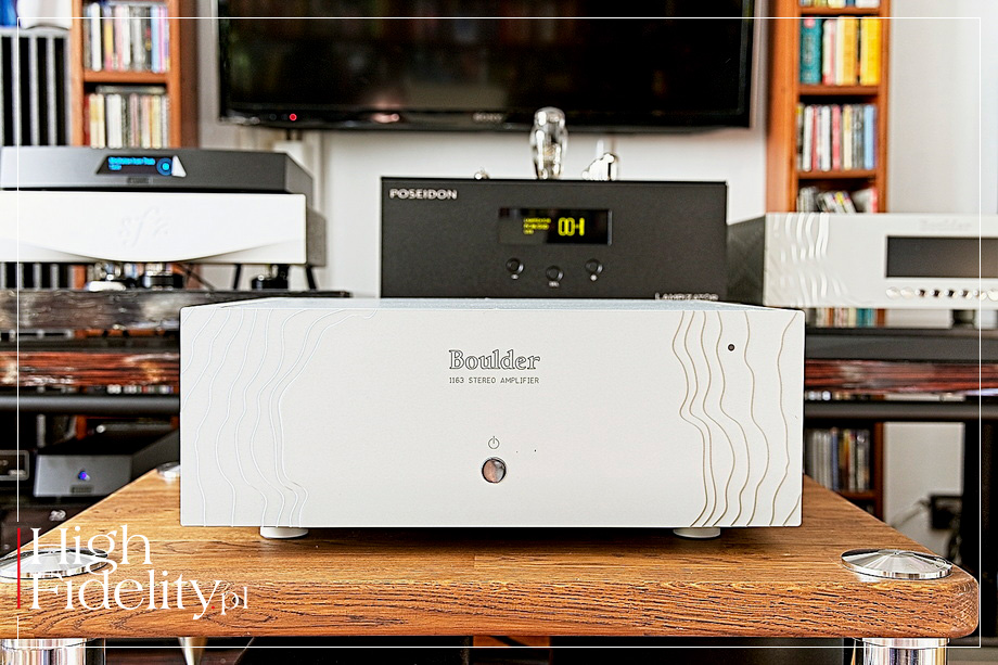COŚ KLUCZOWEGO • Jak widzicie państwo, z zewnątrz trudno jest odróżnić 1163 od poprzednika, a i patrząc na specyfikację różnica pojawiają się głównie na drugim, czy nawet trzecim miejscu po przecinku. Niemniej, jak zapewnia producent, różnice są w rzeczywistości istotne, acz widoczne dopiero wewnątrz urządzenia. Jak można przeczytać w dokumentacji tego modelu, projektując go inżynierowie Bouldera czerpali z rozwiązań opracowanych na potrzeby monobloków 1151. Oznacza to wykorzystanie np. specjalnego zmodernizowanego i przeprojektowanego automatycznego układu biasu („Class A Bias scheme”), który precyzyjnie stabilizuje prąd podkładu eliminując potrzebę ręcznej kalibracji. Kolejnym kluczowym rozwiązaniem jest Smart Current Output Stage („inteligentny prądowy stopień wyjściowy”). Wzmacniacz oddaje pierwsze (zapewne, bo producent tego nie specyfikuje) kilkanaście watów mocy w klasie A, a dopiero przy wyższym zapotrzebowaniu przechodzi do klasy AB. Maksymalnie, przy 8 Ω, potrafi oddać 150 W na kanał. Inteligencja tego układu polega na dostosowaniu podaży prądu/mocy w zależności od bieżącego zapotrzebowania napędzanych głośników. W ten sposób nie tylko ograniczane jest zużycie prądu, w tym straty w postaci ciepła, ale i zwiększana żywotność wzmacniacza, który pracuje w niższych – niż zwykle w klasie A – temperaturach. Dodajmy, iż stopień wyjściowy 1163 wykorzystuje aż czterdzieści tranzystorów wspieranych przez baterię dwunastu kondensatorów filtrujących, co ma gwarantować stabilną pracę nawet przy dużym zapotrzebowaniu na moc i to przy dowolnym obciążeniu. Jego kolejną, charakterystyczną dla marki, cechą, jest ekstremalnie niska impedancja wyjściowa, która ma gwarantować taki sam charakter brzmienia wzmacniacza niezależnie od podłączonych do niego kolumn, nawet jeśli mają one duże spadki impedancji. Wszystkie płytki drukowane użyte w 1163 zostały zmodyfikowane i ulepszone w porównaniu do modelu 1161. Odpowiadający za zasilanie solidny transformator toroidalny zamknięto w solidnie ekranowanej obudowie i wytłumiono zalewając go żywicą. Wytłumiona w czasie montażu obudowy została również pokrywa wzmacniacza. Testowana końcówka mocy korzysta też z autorskiego stopnia wzmacniającego 985, dokładnie tego samego, który stosowany jest w większym modelu, 1162. Urządzenie wyposażono również w nowo opracowany układ zabezpieczający, który ma bezpiecznie i natychmiastowo wyłączać stopień wyjściowy w przypadku zwarcia kabli głośnikowych lub usterek w systemie. ▓ ODSŁUCH JAK SŁUCHALIŚMY • W głównej części testu jako podstawowe źródło udział wziął mój zbalansowany DAC LampizatOr Poseidon, do którego sygnał z mojego customowego serwera (z później również z Lumina U2X) trafiał topowym kablem USB Davida Labogi, Akoyą. Jako że polski DAC wyposażony jest w bardzo dobrą regulację głośności, używałem go zarówno do bezpośredniego sterowania Boulderem, jak i w połączeniu ze zbalansowanym przedwzmacniaczem liniowym Circle Labs P300.