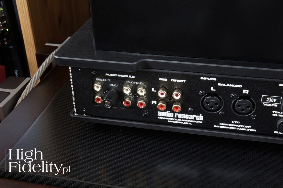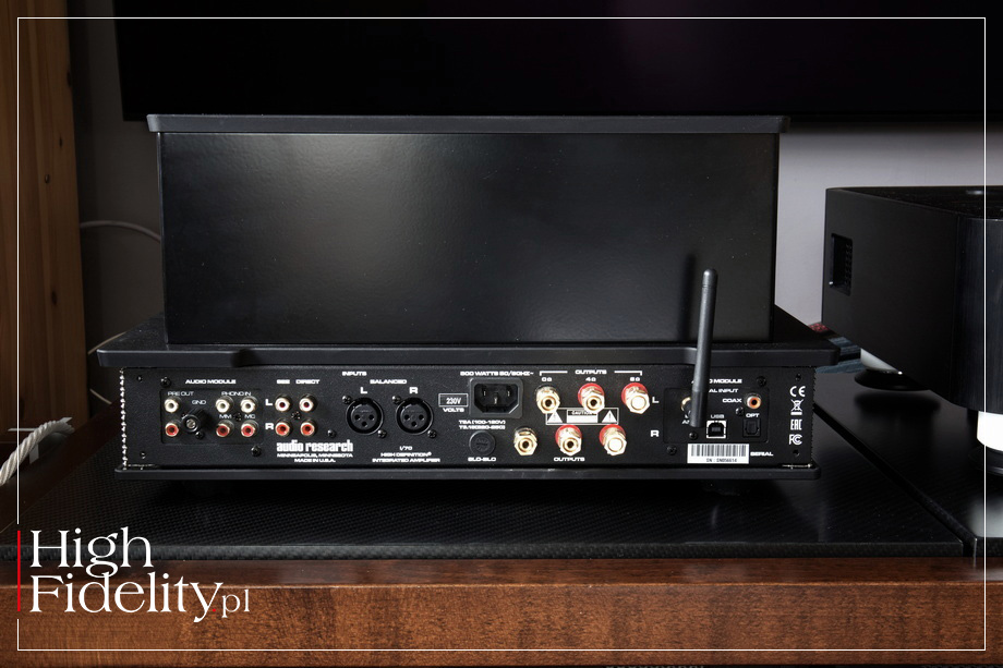 ⸜ I/70. Integrated Amplifier, → AUDIORESEARCH.com, dostęp: 19.03.2026. Wzmacniacz oferuje trzy wejścia liniowe RCA oraz jedno XLR plus słuchawkowe TRS 6,3 mm (duży jack). Ma on budowę niezbalansowaną, wejście XLR jest więc ukłonem w stronę tych, którzy źródło mają dość daleko od wzmacniacza i chcą wykorzystać długie kable połączeniowe. Za wejściami sygnał zbalansowany jest desymetryzowany. Kable głośnikowe podłączmy z kolei do złoconych, solidnych zacisków – wyprowadzono odczepy na 4 i 8 Ω.