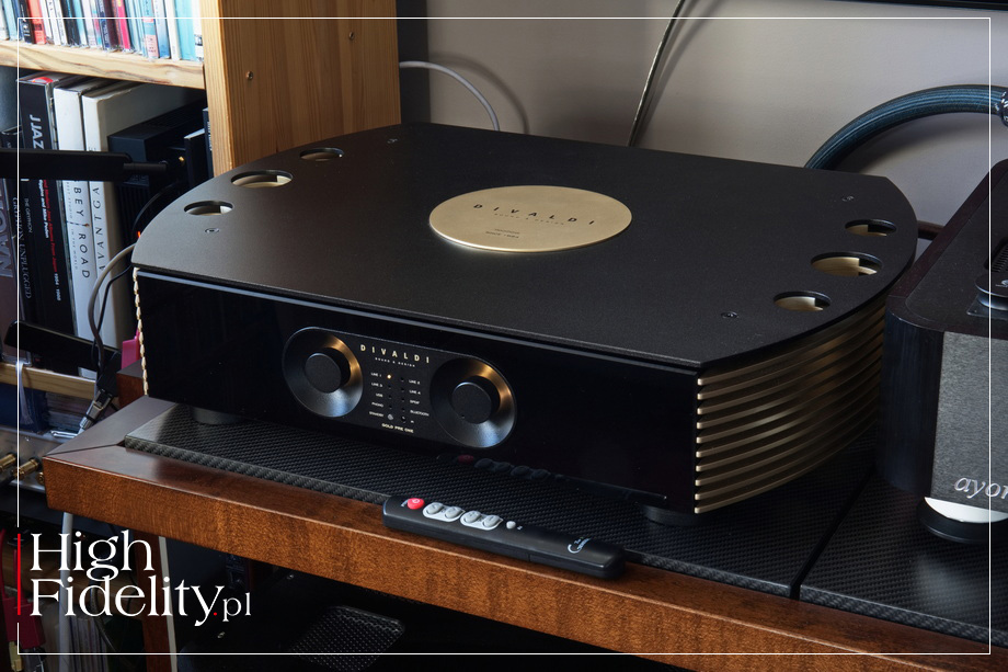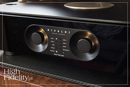 Nie będzie to więc nasycone, „bebechowe” granie, to nie jest tego typu urządzenie. Będzie to natomiast granie bardzo wyrównane – i w paśmie, i w przestrzeni. Nic w tym przekazie nie wyrywa się, nie każe sobie bić brawo. To granie wszystkimi elementami na równie wysokim poziomie. A coś takiego zdarza się naprawdę rzadko, a jeśli już, to trzeba zapłacić za to sześciocyfrowe (mówię o polskim złotym) kwoty. DAC • Przetwornik cyfrowo-analogowy zaaplikowany w Int One jest dość prosty w konstrukcji. To raczej dodatek niż element równoważny DAC-om w drogich odtwarzaczach. Jego rozdzielczość i selektywność są zauważalnie niższe niż w odtwarzaczach odniesienia, czy to Ayonie, czy Sforzato, całość nie jest też tak energetyczna. Mimo to przez dłuższy czas słuchałem tego brzmienia bez poczucia, że coś tracę. Tak, oczywiste jest, że kiedy porównywałem w krótkich przełączeniach AA/BB/AA ˻ 2 ˺ Freddie Freeloader, grany z płyty Crystal Disc wytwórni Audionautes Records, całość słyszana za pośrednictwem „daka” w przedwzmacniaczu „siadała”. Była mniej ekspresyjna i nie tak głęboka. Kiedy jednak słuchałem muzyki w dłuższych seriach, nie było to już tak oczywiste. Wydaje mi się, że moduł przetwornika został odstrojony w taki sposób, aby nie stracić nic z bogactwa dźwięku. Jest tu bowiem i atak, i wybrzmienie, są zróżnicowane barwy, jest też wysoka dynamika. To wszystko względne, o czym mówiłem, a jednak naprawdę fajne. Brzmienie nie jest jakoś szczególnie dociążone, ale to funkcja samego przedwzmacniacza i jego wejść liniowych, a DAC tego nie zmodyfikował, wpisał się w ten idiom. Dźwięk przetwornika cyfrowo-analogowego w Int One jest więc naprawdę fajny. Z kolei sekcja Bluetooth zaskoczyła mnie nisko ustawionym balansem. Bas jest z nią bardziej nasycony i gęsty. Może nie jakość wybitnie kontrolowany, ale nie ma to znaczenia. Jego energia i barwy, jak w Arp Vadany czy Everywhere I Go (Remaind Me) BNYX®, KID CUDI i RÖYKSOPP, były znakomite. I masa – masa była wyjątkowa! GRAMOFON • Jeślibyśmy nie wiedzieli, jakiego rodzaju dźwięku i jakiego sposobu odtwarzania muzyki fanem jest Waldemar Łuczkoś, który współprojektował ten przedwzmacniacz i był głównym projektantem płytki korekcyjnej RIAA, posłuchajmy właśnie tej opcji. Poza tym, że wzmocnienie jest nieco – moim zdaniem – zbyt niskie, będą to najlepiej wydane pieniądze w państwa życiu. Brzmienie przedwzmacniacza gramofonowego w Pre One jest bowiem wspaniałe. Nie znajduję innego słowa na opis tego, co usłyszałem spłycając czy to akustycznego jazzu, czy też mocnego, elektrycznego rocka. To jest brzmienie bardzo rozdzielcze, głębokie i nieco miękkie. Ta miękkość jest przejawem naturalności a nie zakrycia ataku dźwięku. Ten jest szybki i mocny, wręcz natychmiastowy. Rzecz w tym, jak jest on prezentowany, czyli „budowany” przed nami jako całość. Dźwięk przedwzmacniacza jest podawany nam w pełnej formie, z szerokim pasmem przenoszenia i niskimi szumami. Tak więc zarówno jazzowe utwory z wytwórni Blue Note zamieszczone na płycie Thorens 125th Anniversary LP z 2008 roku, jak i mocne łojenie zespołu THE CULT z mojej lubionej, produkowanej przez Ricka Rubina, płyty Electric, były oddane mocno i gęsto – szybko, ale i miękko. ▒ Podsumowanie PRZEDWZMACNIACZ FIRMY DIVALI jest wyjątkowo udanym urządzeniem. Jest on przykładem połączenia wiedzy technicznej oraz wrażliwości muzycznej i jeszcze audiofilskiego wyczucia. Ciekawe, ale jest w tym wszystkim bardzo uczciwy i wierny, jakby konstruktorzy chcieli wprost nawiązać do idei „drutu ze wzmocnieniem”. To pewna idea, a nie realny, osiągalny cel – ale idea niezwykle pociągająca. Pre One gra więc szybko, rozdzielczo i selektywnie. Nie ma jakoś wyjątkowo nasyconego dołu średnicy, a co dawałoby efekt „namacalności”. Może to odstraszyć lubiących „,lampowe” brzmienie. Kiedy jednak posłuchamy muzyki dłużej, kiedy odrzucimy stereotypy, okaże się, że w tym przekazie odnajdziemy i naturalność, i miękkość, i precyzję. Wyjątkowo przekonywająca była również przestrzeń, z wyraźnymi źródłami pozornymi, ale nigdy nie przekraczającymi bariery nienaturalnego wycinania z tła. Ważną cechą testowanego przedwzmacniacza jest jego modułowość. Wśród dostępnych opcji rewelacyjny wydaje mi się przedwzmacniacz gramofonowy, zastępujący zewnętrzne drogie urządzenia do – nie przesadzę dziesięciu tysięcy złotych. DAC jest fajnym dodatkiem, z bardzo dobrym łączem Bluetooth. Ale nie miejmy złudzeń – dobry odtwarzacz CD (SACD) czy plików robi to lepiej. Jeśli jednak ma to być element pomocniczy – super, będzie OK. Bardzo mi się to urządzenie podobało. Jest drogie, a jednak w high-endzie może się wydawać okazją cenową. Znakomicie zbudowany produkt z tak dobrym dźwiękiem dający mnóstwo radości – polecam! ▓ BUDOWA OD STRONY MECHANICZNEJ budowa przedwzmacniacza Gold Pre One jest niemal identyczna z tym, co widzieliśmy we wzmacniaczach – zintegrowanym Int One oraz mocy Pa One. I to ona sprawia, że zanim jeszcze posłuchamy produktów Divaldi mamy o nich wyrobioną opinię. Urządzenie jest szersze niż zwyczajowe 440 mm (to szerokość, tak zwanego, „racka”, czyli szafy montażowej w studiach nagraniowych). Poszerzenie to wzięło się z tego, że zamiast klasycznych radiatorów z gotowych lub frezowanych modułów są one w Pre wykonane w układzie poziomym. Górna i dolna blacha są lakierowane na czarno, a wszystkie pomiędzy nimi są złote. I to właśnie połączenie złota oraz czerni definiuje wygląd tego urządzenia. Radiator, o którym mowa, to składany ręcznie stos z płyt aluminiowych do którego zamontowano duży element miedziany i do którego dopiero montowane są tranzystory. Jak mówi producent, takie rozwiązanie „zapewnia idealne wręcz