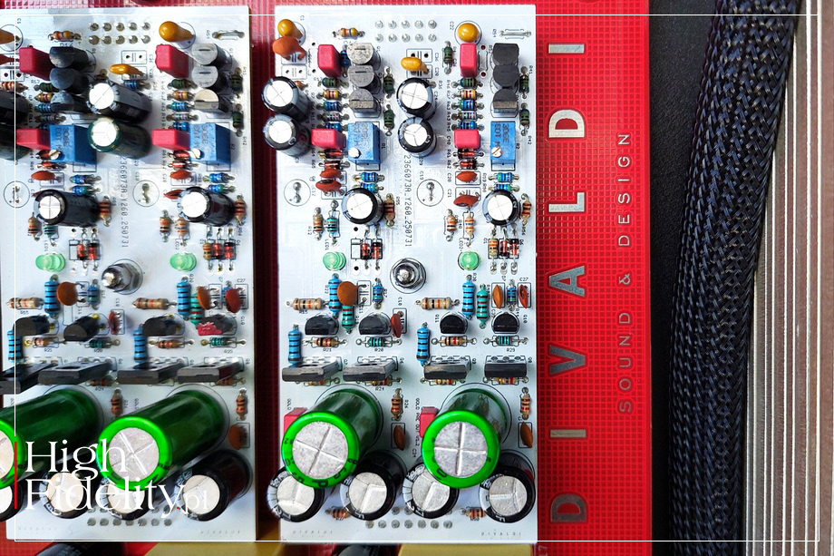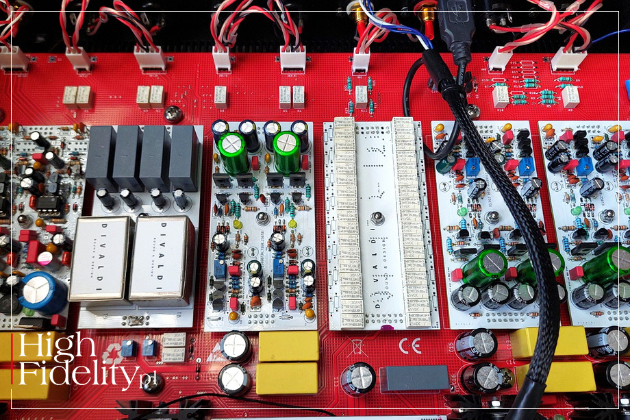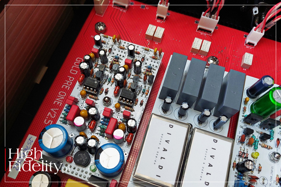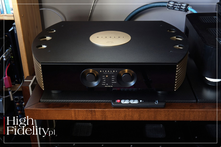 GOLD PRE ONE to przedwzmacniacz nowoczesny w swojej funkcjonalności, a jednocześnie zakorzeniony w najlepszych tradycjach projektowania sprzętu audio. Oferuje brzmienie transparentne, nasycone i muzykalne, będąc znakomitym uzupełnieniem każdego zaawansowanego toru audio. ⸜ Tamże. Podstawą urządzenia wspólną dla wszystkich kombinacji jest jego obudowa, zasilacz oraz główna płyta; producent mówi o niej „płyta bazowa”. Znajduje się na niej kilka stopni zasilaczy stabilizowanych, osobno dla części cyfrowej oraz osobno dla toru analogowego, dla którego w pierwszym stopniu zasilacza zastosowano – jak czytamy – zestaw kondensatorów o łącznej pojemności około 30 000 µF oraz transformator typu R-Core. Na płycie głównej umieszczono pozłacane gniazda do podłączania modułów oraz specjalnie zaprojektowany system ich mocowania. Urządzenie może wystartować od dwóch wejść RCA i dwóch XLR, drabinki rezystorowej w roli tłumika oraz wyjść analogowych RCA i XLR. Do nich można dodać: przedwzmacniacz gramofonowy MM/MC, przetwornik cyfrowo-analogowy oraz wyjście do nagrywania. Możemy to zrobić w dowolnej chwili i w dowolnej kolejności. Daje to naprawdę szerokie możliwości „customizacji”, podobnie jak niegdyś w moim ulubionym przedwzmacniaczu Burmester 808, teraz dostępnym w wersji Mk 5. FUNKCJONALNOŚĆ • W podstawowej konfiguracji możemy wybrać tylko liniowe wejścia oraz wyjścia. Jak wspominaliśmy przy okazji poprzednich testów, firma Divaldi ma korzenie w systemach profesjonalnych. A tam jednym z często spotykanych rozwiązań są transformatory separujące – znalazły się one również i w Pre One. Dzięki nim do przedwzmacniacza prześlemy zarówno sygnały symetryczne, jak i niesymetryczne, a każde z wejść będzie odseparowanie galwaniczne od aktywnych stopni przedwzmacniacza. Producent pisze, że zastosowanie transformatorów wejściowych zapewnia również „stałe parametry całego modułu niezależnie od podłączanych różnych źródeł sygnałów liniowych”. Wybór wejścia z gniazd niesymetrycznych (dwa wejścia RCA) i symetrycznych (dwa wejścia XLR) odbywa się za pomocą przekaźników z pozłacanymi stykami. Do czterech wejść liniowych możemy dodać, jeśli chcemy, moduł przedwzmacniacza gramofonowego. Jest to ważny element składowy przedwzmacniacza, ponieważ jest on jednym z „koników” Waldemara Łuczkosia, który jest jednym z projektantów firmy Divaldi i który przywiózł do mnie przedwzmacniacz. Jest to pierwszy przedwzmacniacz gramofonowy w ofercie tej firmy. Mowa o przedwzmacniaczu z korekcją RIAA przeznaczonym do współpracy z wkładkami gramofonowymi MM oraz MC. Wyboru wkładki dokonuje się przełącznikiem na tylnej ściance urządzenia, a obrotowymi regulatorami dopasowujemy impedancję obciążenia dla wkładki MC (9, 10, 12, 14, 17, 20, 30, 40, 75 i 100 Ω). Na życzenie producent może dobrać te wartości według naszej specyfikacji. Jak czytamy, pierwszy stopień wejściowy wykonany jest w oparciu o tranzystory polowe (FET) oraz „dedykowany do audio wzmacniacz operacyjny”. I dalej: