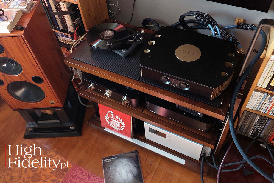 ⸜ Tamże. Gniazda są solidne i rozstawione na tyle daleko od siebie, że można stosować nawet grube interkonekty. Ponieważ są wpuszczone w głąb obudowy, nie zmieściły się w nich wtyki interkonektów Siltech Triple Crown, z których zazwyczaj korzystam. Przedwzmacniacz jest sterowany pilotem zdalnego sterowania. W czasie testu dostępny był tylko prosty, plastikowy pilot, który w przyszłości ma być zastąpiony autorskim opracowaniem. Urządzenie wygląda znakomicie, jest niezwykle solidnie wykonane i ładnie wygląda, tak po prostu. ▓ ODSŁUCH JAK SŁUCHALIŚMY • Przedwzmacniacz Divaldi Gold Pre One był testowany w systemie referencyjnym HIGH FIDELITY. Porównywałem go do przedwzmacniacza Ayon Audio Spheris Evo, a sygnał był wysyłany do tranzystorowego wzmacniacza mocy Soulution 710. Podczas testu urządzenie stało na swoich nóżkach, na górnej, węglowej półce stolika Finite Elemente Pagode Edition Mk II.