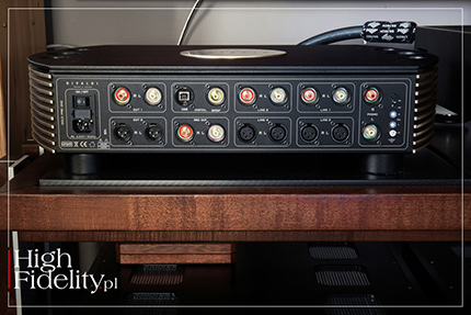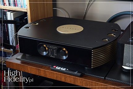 ⸜ Tamże. Drugim ważnym modułem jest moduł cyfrowy. Oferuje on trzy wejścia: USB-B, S/PDIF (RCA) oraz Bluetooth. Do konwersji sygnałów cyfrowych został wykorzystany prosty przetwornik cyfrowo-analogowy firmy Burr-Brown – kompletne rozwiązanie wypuszczające na zewnątrz sygnał napięciowy 2 V. Jest to układ wybrany spośród wielu koncepcji jako ten który, jak zapewnia firma, „spełnia [jej] oczekiwania dźwiękowe”. Sygnał cyfrowy z wejścia USB oraz Bluetooth jest przetwarzany przez procesor nowej generacji STM z autorskim oprogramowaniem. W celu eliminacji wpływu sygnałów cyfrowych na tor analogowy, moduł cyfrowy posiada własny tor zasilania, obejmujący transformator oraz kilka liniowych stabilizatorów napięcia dla każdego stopnia. Do modułów koniecznych dla pracy tego typu urządzenia zaliczają się również tłumik oraz układy wyjściowe. Ten pierwszy jest zbudowany w oparciu o drabinkę rezystorową przełączaną przekaźnikami. Tutaj jest to układ w pełni analogowy, ale sterowany cyfrowo. Liniową regulację zapewnia procesor konwertując sygnał z potencjometru poprzez przetwornik A/C na zestaw odpowiednio załączanych przekaźników, tym samym zmieniając poziom głośności. Otrzymany sygnał jest dostarczany do modułu wyjściowego.