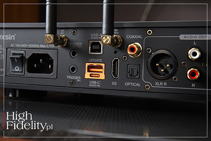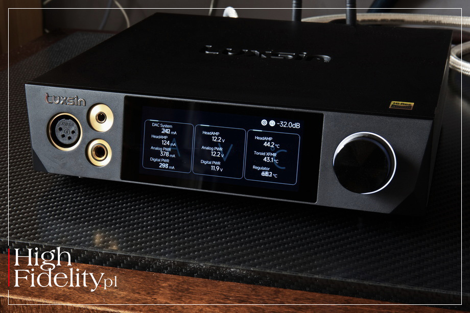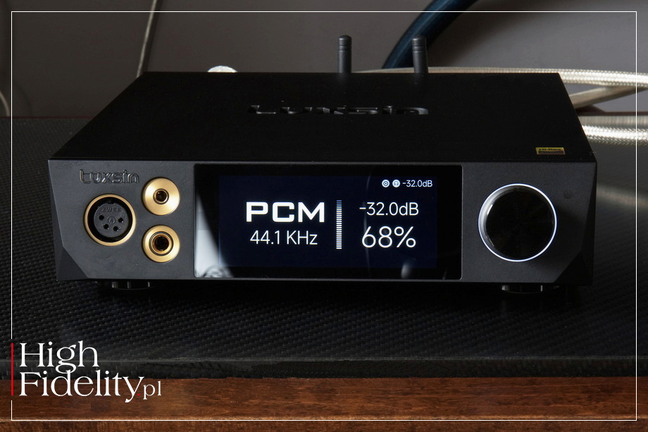 ⸜ → LUXSINAUDIO.com, dostęp: 25.03.2026. ▓ X8 X8 JEST JEDNYM Z DWÓCH przetworników cyfrowo-analogowych w ofercie firmy Luxsin, tańszym. A mimo to ma imponującą budowę, funkcjonalność oraz specyfikację. I wygląda naprawdę bardzo dobrze. Jego front okupuje przede wszystkim 4-calowy, pełnokolorowy ekran dotykowy o rozdzielczości 1080p (960×480), który – jak zapewnia producent – „zapewnia ostry, szczegółowy obraz oraz płynną, intuicyjną obsługę”. Jego panel przedni jest nachylony pod kątem 15°, co ma być ukłonem w stronę ergonomii i poprawy widoczności wyświetlacza, ma również ułatwiać obsługę. Wykonany z solidnej, obrabianej CNC aluminiowej obudowy ma pomóc w efektywnym odprowadzaniu ciepła. Ważne wydają mi się proporcje urządzenia oraz rozmieszczenie elementów na jego przedniej i tylnej ściance. Jeśli dobrze widzę, jest to zapożyczenie z przetworników firmy Mytek, na przykład Brooklyn Bridge II. Mytek tego nie wymyślił, on też to zapożyczył, ze sprzętu studyjnego, ale właśnie firma Michała Jurewicza odpowiada za zaszczepienie tego typu dizajnu w domowym audio, zarówno w odtwarzaczach plików, jak i przetwornikach D/A. Dizajn tego typu jest ergonomiczny i ładny. Jest to o tyle poręczne, że podstawową rolą X8 jest zamiana sygnału cyfrowego na analogowy. Możemy użyć też jego wzmacniacza słuchawkowego, z wyjściami zbalansowanymi i niezbalansowanym; urządzenie ma również regulację poziomu wyjściowego dostępnego na wyjściach RCA i XLR. Oferuje on pięć wejść cyfrowych: IIS, USB-B, USB-C oraz optyczne i koncentryczne RCA, dwa rodzaje wyjść liniowych: XLR i RCA, a także trzy różne wyjścia słuchawkowe: 4,4 mm (Pentaconn), 4-pin XLR oraz klasyczny TRS 6,35 mm (duży jack). Luxsin może pracować z regulowanym wyjściem liniowym. Nie jest to równoważne z przedwzmacniaczem, ale pozwala zestawić prosty system z końcówką mocy lub aktywnymi kolumnami. Głośność regulujemy w łatwy sposób gałką na przednim panelu, z pilota zdalnego sterowania lub przez aplikację Luxsin Control, dostępną zarówno na urządzenia z iOS, jak i Android. ‖ FUNKCJONALNOŚĆ X8 W SWOJEJ PODSTAWOWEJ roli jest przetwornikiem cyfrowo-analogowym. Przez wejścia IIS, USB-B i USB-C prześlemy do niego sygnał PCM do 768 kHz, 32 bity oraz DSD512 (Native), a przez optyczne Toslink i koncentryczne RCA PCM do 192 kHz, 24 bity. Sygnał jest prowadzony przez cały tor, również cyfrowy, w postaci zbalansowanej. Ważnym elementem konstrukcji X8 jest rozbudowany moduł przetwarzania sygnału cyfrowego. Producent określa go jako Digital Audio Core. Jest to układ oparty na dwurdzeniowym procesorze DSP HiFi-5 i architekturze ARM STAR, wyposażony w dużą pamięć SRAM wbudowaną w układ oraz procesor DSP pracujący z częstotliwością ponad 500 MHz. Ma on pozwolić na wykonywanie złożonych operacji na sygnale w czasie rzeczywistym, takich jak filtracja, korekcja czy analiza sygnału.