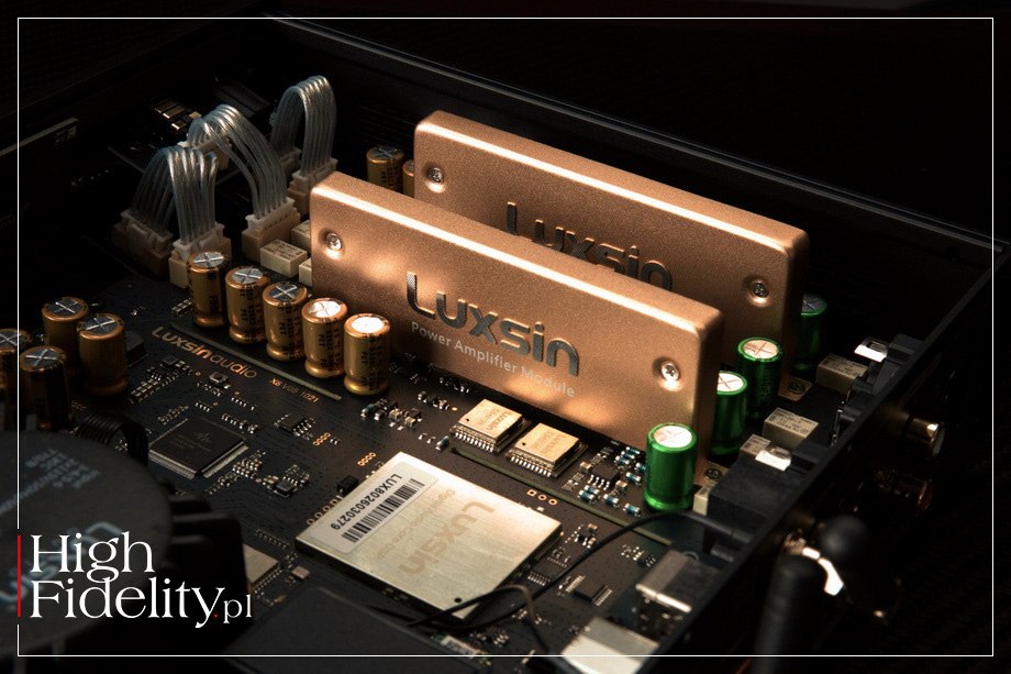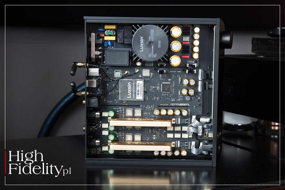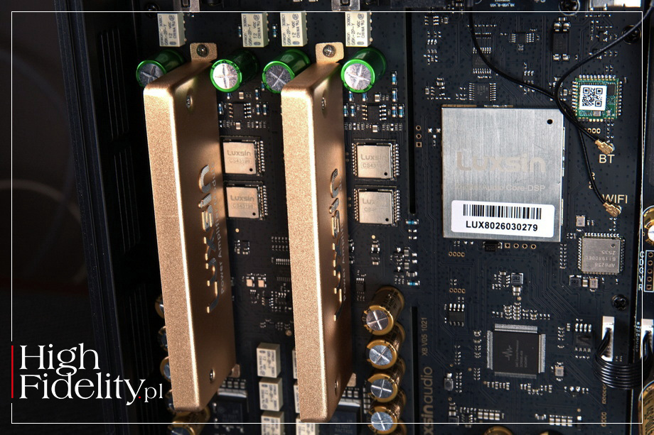 Profesjonalne strojenie jest teraz dostępne dla wszystkich. Steruj nim płynnie za pomocą aplikacji mobilnej lub interfejsu internetowego na komputerze, korzystając z pełnej obsługi wielu języków, aby cieszyć się prawdziwie elastycznym i inteligentnym doświadczeniem słuchowym. ⸜ X8, → LUXSINAUDIO.com, dostęp: 26.03.2026. DAC X8 daje nam również dostęp do innych funkcji cyfrowego przetwarzania sygnału. Funkcja Crossfeed symuluje doświadczenie odsłuchu z głośników, ale przez słuchawki, mieszając – w odpowiednich proporcjach – kanały lewy i prawy, co ma redukować zmęczenie słuchu typowe dla długich odsłuchów słuchawkowych. Użytkownik ma również kontrolę nad szerokością sceny stereo. Dodatkowo system wyposażono w funkcję Tone Adjust do szybkiej korekcji barwy oraz inteligentny układ Loudness. Ten ostatni automatycznie kompensuje niedobory niskich i wysokich częstotliwości przy niskich poziomach głośności. Jak widać, to niewielkie urządzenie przypomina rozbudowaną konsolę w studiach masteringowych, jest jednak – jak się okazuje – łatwe w obsłudze. ‖ TECHNIKA DAC • X8 firmy Luxsin ma budowę dual-mono, choć układy obydwu kanałów są umieszczone na jednej płytce. Elektrycznie są one od siebie całkowicie odizolowane – począwszy od sekcji zasilania, przez układ ścieżek na płytce drukowanej, aż po samą ścieżkę sygnałową. Dzięki temu, jak zapewnia producent, przesłuchy międzykanałowe „zostały niemal całkowicie wyeliminowane”, co skutkuje „niezwykle stabilnym obrazowaniem i klarowną prezentacją przestrzeni dźwiękowej”. Zamiast pojedynczego układu przetwornika D/A w X8 zastosowano osiem identycznych, stereofonicznych układów pracujących równolegle. Konfiguracja tego typu jest często spotykana, ponieważ firma ESS Technology wprowadzając w 2008 roku na rynek swój ośmiokanałowy DAC, model ES9008, umożliwiła łączenie jego kanałów po cztery, dając na wyjściu sygnał stereofoniczny, ale o niższych szumach i zniekształceniach. Było to powtórzenie gestu stosowanego przez najlepsze firmy, jak Accuphase, które od lat stosowały w swoich DAC-ach kilka osobnych przetworników łączonych równolegle. Luxsin wraca do tej pierwotnej wersji, to jest osobnych „daków”. To droższa, ale – jak zapewnia producent – lepsza metoda. Każdy z ośmiu przetworników cyfrowo-analogowych CS43198 jest wyposażony w ekran. Jest on nakładany nie na sam układ, a na małą płytkę, na której znalazł się zarówno DAC, jak i towarzyszące mu elementy bierne. W czym przypomina rozwiązanie stosowane przed laty przez firmę Marantz w układach HDAM (Hyper-Dynamic Amplifier Module). Jak zapewnia producent, ekran izoluje przetworniki od obwodów cyfrowych i zakłóceń o wysokiej częstotliwości, a jednocześnie wspomaga odprowadzanie ciepła i utrzymanie równowagi termicznej. Taka konstrukcja ma ograniczać szumy i jitter, zapewniając „stabilną i niezmienną jakość dźwięku podczas długotrwałego odtwarzania w wysokiej rozdzielczości”. Aby taka architektura działała poprawnie, wszystkie układy muszą być idealnie zsynchronizowane – to dlatego propozycja ESS Technology była tak atrakcyjna, nie trzeba się było tym przejmować. Jak informuje Luxsin, w X8 zastosowano „specjalny system” buforowania i dystrybucji sygnału, który „zapewnia synchronizację wszystkich przetworników”. Układ ten odpowiada za równoczesne przesyłanie danych cyfrowych do poszczególnych przetworników. Dzięki temu, jak dalej czytamy, „każdy z nich przetwarza sygnał w identycznym momencie, co zapobiega rozbieżnościom czasowym w torze audio”.