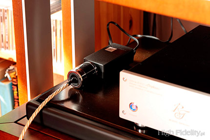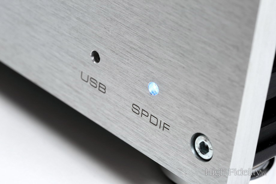 Front panel with logo and some inscriptions is made of aluminum. It sports a very good, widely used for high-end devices power switch and two LEDs, that indicate an active input. Both: power switch and LEDs are blue - rigueur of late XX and beginning of XXI century. Unfortunately there is no way of checking sampling frequency of input signal, not to mention bit count. User is also not informed whether input is in sync with source. This is not a problem when using a CD transport, but when it comes to communication with a computer, where something might always go wrong, without such indicator user doesn't know where to look for a problem. It seems that for latest D/A Converters such an indicator is a must.
