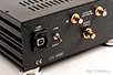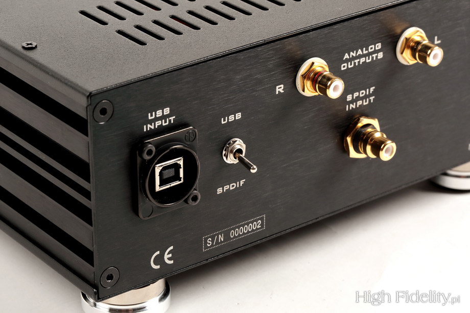 The rest of the chassis is also made of aluminum. There is a larger logo on the upper panel, which seems a nice touch further improving aesthetics of this device. They used high quality input sockets – USB comes from Neutrik. There is a small flip switch between inputs that acts as an input selector. There is also an analogue, unbalanced output with gold-plated RCA sockets. Next to it there is this also gold-plated, multi-pin power inlet. The device sports solid, good looking multi-layer feet made of aluminum and rubber.