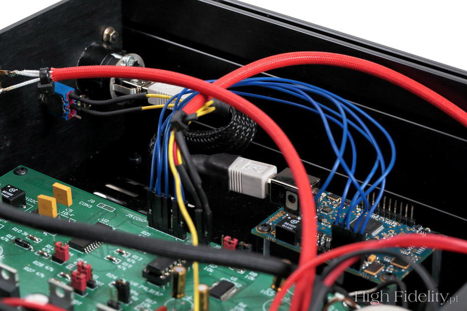Inside the whole circuit sits on two PCBs. The smaller hosts USB receiver and a converter to S/PDIF. It is based on a XMOS chip. It accepts PCM signal up to 32/384 and DSD (DoP) signal.