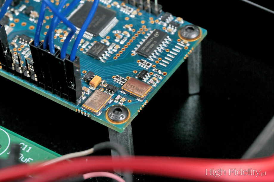Signal runs through a short USB cable from input. I wonder whether it would be possible to eliminate this cable. This circuit sport a separate oscillator, and an input signal is re-clocked with another high quality two separately for 44,1 and 48 kHz (with multiplayer) signals. Signal is than transferred to the next PCB with thin wires and buffered by matching transformer.