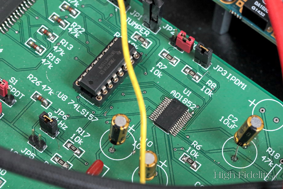 Exactly the same transformer is used for S/PDIF input and placed on the main PCB. It is clear that USB signal's path is much longer. PCM signal from RCA input lands in Cirrus Logic CS8416 (24/192) receiver, that is no longer produced. Finally signal goes to a DAC chip - Analog Devices AD1852. It is capable of receiving 24 bit/ 192 kHz signal. So it seems that any signal with higher resolution has to be converted somewhere along the signal's path. DAC chip converts all signals into 24bit ones.