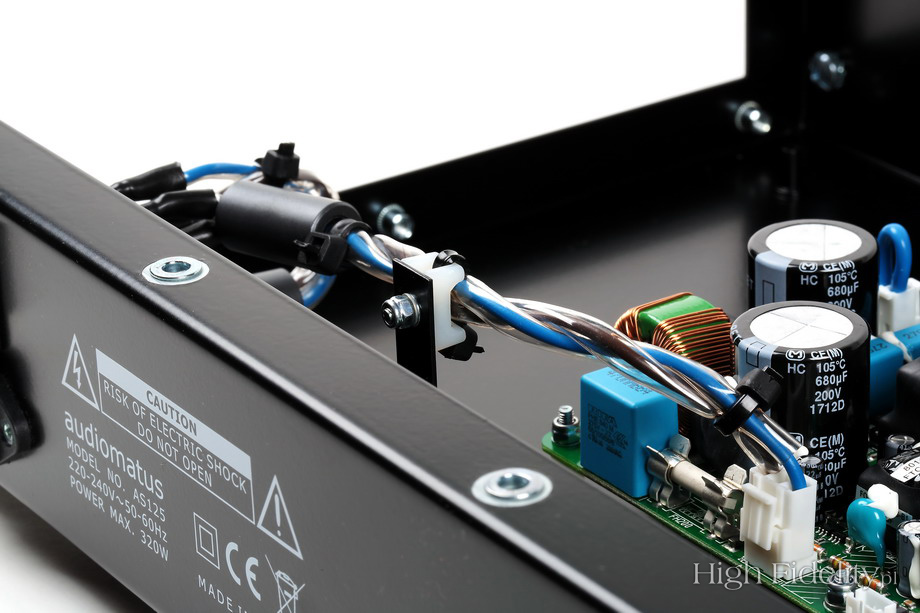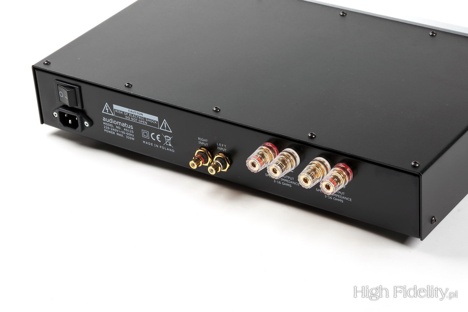 But one can notice that this technology entered also a high end market. I believe that what caused it were successful experiments of such high-end brands as Burmester, Naim, Dynaudio, Focal-JMLab and so on, in the field of car audio – this segment of audio market benefited from this technology most. These experiments led to the change of high-end companies' approach and ultimately to development of much better solutions for this type of designs. Today high-end market revolves around three technologies – tubes, solid-state class A, B and AB and, also solid-state, class D. The powerful mono amplifiers by Jeff Rowland – Model 925 – or Mark Levinson's – No.53 – changed the way audiophiles perceived class D. Top devices, using different technologies, offer a bit different view on how should sound “look like”. The times when “solid-state” meant: bright, harsh, and “tube” meant: warm, sweet, nice are gone. But still each technology presents certain characteristic qualities, or has advantages in certain areas over the others. In comparison class D amplifiers, I mean the analogue ones, according to stereotypes, seem to offer sort of “tube-ish” sound. Usually it is a warm, smooth sound, easily spoiled by incorrectly chosen cables, speakers, or poor quality source or preamplifier. One has to know though, that also this technology has been significantly developed, improved over last years. The AS125 clearly shows the direction these changes has taken. It's a stereo power amplifier using a third generation Bang & Olufsen ICE Power module. This means it's a class D amplifier with SMPS. According to the manufacturer it is an improved version of an older model, AS100 – it so happens that I haven't heard this one. The design of B&O module implicates that this amplifier is intended to “drive mid- and high-efficiency speakers in small and mid-size rooms”. “Large output current and very efficient safety circuits allow this amplifier to drive even most difficult speakers with “unfriendly” impedance curve.” Since it is a „second class isolation” device (the ground wire is not connected with device's ground) so it can not be a cause of a ground loop”. This means that it will work very well in systems with computers and streamers as sources. ![]() ANDRZEJ W. MATUSIAK AS125 is an improved version of our previous model, Audiomatus AS100. It is a stereo power amplifier, build around a third generation ICEpower 125ASX2 module. The ICEpower module working in AS125 was modified in such a way, that at the mid-levels of output power the measurable and audible parameters were significantly improved at a cost of a small, 2 per cent decrease of energy efficiency (energy efficiency for small and large output power didn't change). AS125 was designed to minimize noise emission and to reject noise coming from the system. Despite the fact the 125ASX2 module complies with noise emission norms we decided to place it in a solid (shielded) housing and selected ferrite beads were installed on speaker cables and on power cable. These elements, as well as particular placement of the module within amp's chassis, allowed us to additionally decrease level of noise and to achieve noise emission level few times lower than required by standards. The input stage of the AS125 sports low-pass filters that eliminate noise at frequencies far beyond acoustic range (these filters do not effect frequency range of audio signal). We minimized length of the internal wiring to even further improve noise resilience. AS125 is a second class isolation device (the electric ground of the device is not connected to the protective conductor). This solution means that there is no risk of ground loops. All above described features mean, from technical point of view, that AS125 might be used in any audio system, especially in ones with computer source. Such systems often exhibit issues with ground loops and high frequency noise. AS125 should do very well in such system. ![]() AS125 is a power amplifier. Mr Matusiak claims that high input impedance make it suitable for combining it with both, passive and active preamplifiers. It is obviously true but I think that best sonic effect should be achieved with active preamplifiers or with CD Players with adjustable output (but not with just attenuator). It is important to mechanically decouple this power amp. We all know how important that is for tube devices and many believe that solid-state ones are immune to vibration. But it is not true, especially when it comes to class D amps. So when using such device we should provide it with optimal working conditions. For this test I placed AS125 on Franc Audio Accessories Ceramic Disc feet, and these were placed on the Acoustic Revive RAF-48H pneumatic platform. The on/off switched is located on the rear panel. Power consumption in idle mode is minimal so one can leave the amplifier on permanently. It is recommended also because this amp presents its full potential after 30 minutes from turning it on, despite the fact that there are no elements that need to achieve optimal temperature. ![]() ![]() Płyty użyte do odsłuchu (wybór):