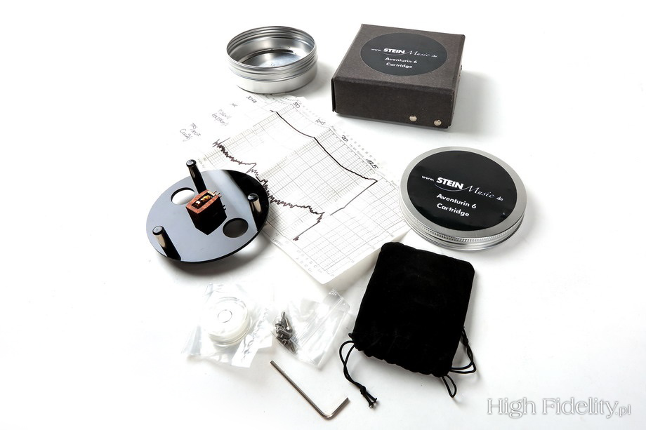 Better, more expensive cartridges offer even better bass extension, are even more resolving, and for example Madake – delivers even bigger instrument's body. The latter paints images with thicker lines, and bass is not so well defined. On the other hand the whole presentation (with Madake) seems more palpable, more solid. The top ZYX cart dives deeper into all elements creating the music one listens to. That's what makes it it such a refined pickup. Surprisingly enough Stein doesn't really fall too far behind and it offers an amazing soundstage. It's the kind of presentation that makes listener feel like he's participating in a live performance – it takes us to an acoustic environment of the recording instead of bringing it to our room. It distances listener from performance a bit, which comes particularly handy when listening to jazz and classic music. And yet when I played some hip-hop and “heavier” electronic music there was groove, bit, bass, and lot of fun, too. Summary Despite the fact, that I could clearly hear some advantages of both Japanese pickups mentioned above, that I could hear that a mono cart Zero (Miyajima) offered more “sounds in sound”, each time I returned to Stein I was eager to hear what it would offer from each next record. I used it to listen to the music from a TV show Sonda, produced from a digital master, some hip-hop music by Rasmentalism from a limited edition single, and many other records that waited in a long line for the first listening session like, for example, the new issue of the Tron OST by Daft Punk. In short – this cart offered a very rich, highly enjoyable performance. Sure there are few carts that are even more resolving, offer better definition, but still I liked this lively, soulful performance of Aventurin 6 a lot! ![]() The box this cartridge is packed in already catches the eye. OK, one might say that this is normal – after all packaging is the first thing one sees and only then whatever is inside. And yet, many packagings of even high-end audio products are made only to protect what's inside them and not to make it more attractive for a buyer. The box Stein cartridge come in already communicates to the buyer that the maker not only did think every aspect of the product through but also had a very good taste. The outer shell is a carton box and inside one finds a metal box that brought to my mind a shoe polish box, but a bigger one. There is enough a filling material (paper) in carton box so that metal box stays in place. One has to unscrew a cover of the metal box to find a cartridge inside. The pickup is fixed to an acrylic ring with screws. After getting cartridge out one gains access to some documents, like measurements results, and a small velour bag. Inside the bag one finds a set of screws and a small level. The body of the pickup is square so the setup is quite simple.
