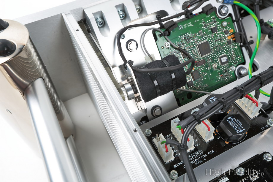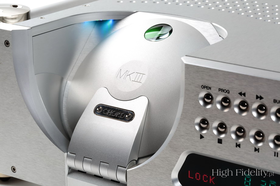 I mentioned how spacious this presentation was in terms of transparency and selectivity. But using only these two features would not be enough for the Player of such, highest quality. Few minutes with Red is enough to describe soundstage it delivers as dense, rich, full. All elements are palpable and seem to be natural in size. But the phantom images are rendered closely to listener. The ones situated in the back of the soundstage are moved closer to the front, and those in front stay where they belong. As listener I had an impression of a very rich soundstage with many events happening on it. Even more so as Red perfectly reproduces the scale of each instrument in a way it was recorded (not the real scale but a recorded one). That's why sound has a big scale. One has to realize that the further away from the front of the stage phantom images are the worse is the differentiation of their scale – all seem rather large and sport sort of a “halo” around their body. The already mentioned Depeche Mode vocalist is placed clearly in the back of the stage, but with Chord he was moved closer to the front, more or less to the same layer as the guitar. Same happened with Carol Sloane vocal on Hush-a-bye. In orchestral recordings, like in Bach Rewrite, the electrical instrument in the front (Wurlitzer and Rhodes) seemed placed quite close to the acoustic ones behind them – cellos and violas. All instruments played in perfect harmony, music was presented with great clarity and nicely differentiated. But instruments seemed placed closer to each other than usually. Summary There are no perfect CD Players (nor other audio devices) so some sound modifications are unavoidable. The ones I pointed out in Red most likely are the results of choices its designers made, and limitations of technology itself. They also make sense, I mean discussing them makes sense but only when top quality devices are discussed and differences between them and we have to keep in mind that by discussing these differences we talk about individual preferences rather that some universal principles. Red Reference MkIII presents a wonderful, musical world with all of its elements being equally important, making sense, and being highly likable. This device sheds a lot of light into each recording without making them sound bright. Bass is nicely extended and perfectly controlled. Midrange is rich although not as resolving and as silky as both range extremes. It delivers large scale phantom images. The back of the soundstage seems to be brought closer to the listener because images of the instruments playing there are large. Red is a great all-rounder that will last in your systems for many years because of its sound and build quality. ![]() Chord devices might be used as model mechanical designs other could learn from. It includes the Red Reference MkIII Player with its chassis suspended on four metal rods, mounted on four, solid feet. Chassis is made of thick aluminum plates – that constitutes a very stiff structure. There are two finishes available – black, or natural aluminum; in both cases feet are made of a silver, polished steel. Front and top panel It's not a real top loader although it does not sport a classic drawer either. It is more similar to the former though, as z CD is placed over the axis of the motor. The difference being the axis that is not vertical but placed at 45° angle. The mechanism sports a large, aluminum lid moved by a small motor. This motor is a bit noisy and the movement of the cover is not as smooth as the movement of a drawer in dCS or Accuphase Players. It reminded me a solution I'd known from Loit Passeri Player, manufactured in Singapore. Players features Philips CD Pro-2LF transport mechanism that sits on springs. The whole transport mechanism is separated from both, power supply section and digital inputs, as well as from DSP and DAC section. Manufacturer decided to replace the element where user puts a disc on with a metal one to use a magnetic clamp. The clamp works together with the lid so it had to be rather small. The lid features a small 'window' that allows user to see a spinning disc – it reminded me of the first CD Players in history like: Philips CD100 and Sony Goront. On top panel one finds sort of magnifying glass that allow to have a look at digital filter circuits. Front panel holds two rows of push-buttons including those to change the buffer value and sampling frequency. In 2012 in his review for „Hi-Fi World” Rafael Todes described a bug in Player's software – one could change sampling frequency only when one of the digital inputs were chosen When CD was used this function was inactive. Obviously nothing changed in this matter as the unit under review behaved in exactly the same way. Rear panel Rear panel sports an abundance of connectors including analogue outputs (XLR and RCA), digital inputs – AES/EBU, TOSLink and USB (HD), and digital outputs – TOSLink, RCA (S/PDIF) and double AES/EBU. Sampling frequency of the digital output signal is user selectable. One finds there also BNC sockets that can be used to connect device with external word-clock, or to connect external device with Red's internal clock. In theory these were added to help integration within digital recording/mastering studio but I wonder if one could use it also with one of the audiophile class word-clocks available on the market. Inside Inside is divided into two parts with a horizontal aluminum plate. In the upper section there is a DAC with filters, USB input and DSP. DAC is a discrete design – its a arrangement of resistors, transistors and capacitors soldered on a PCB. There is also a separate digital filter – it's a large DSP with implemented upsampler and buffer. Usually most of this functions are implemented in a single, integrated DAC chip.