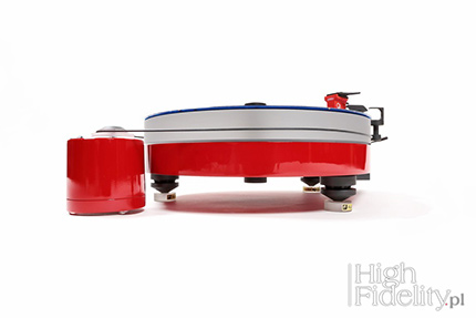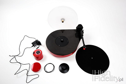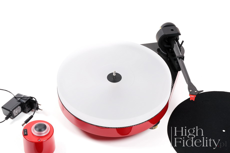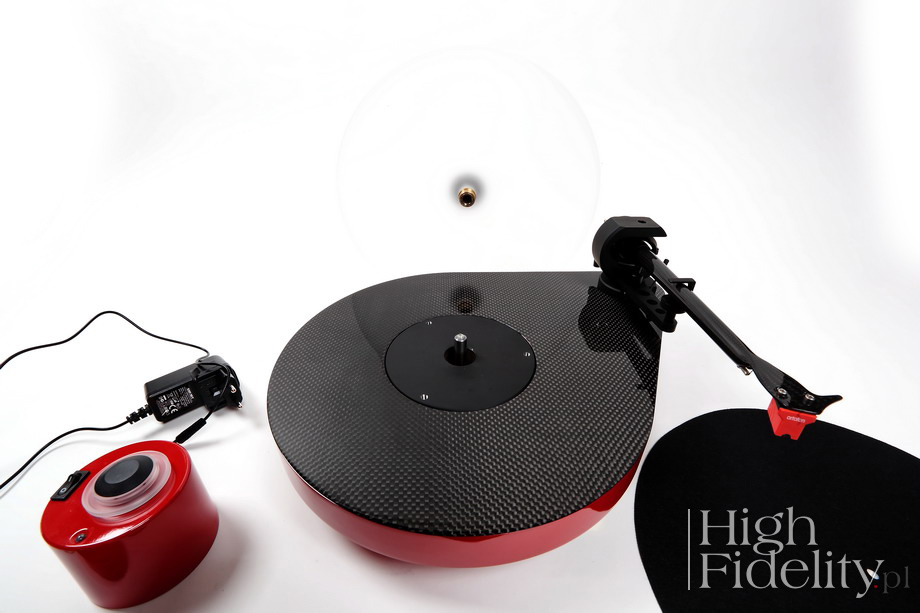 RPM in this particular case means also “Round”. Unlike classic designs these ones features base with rounded edges. It's shape always reminded me of a drop of water. Its wider part measures 300mm across (just like the platter) and the narrower part hosts tonearm. Nine years is a long time and so the new RPM5 Carbon version shares only the shape with the older one, all the rest has been upgraded more than once over the years. RPM5 Carbon It is still a belt-driven, non-suspended mass-loader with a 9” tonearm. It features a low profile but also a sturdy appearance. Its base is made of MDF, that features additional metal weights that focus larger part of turntable's weight around main bearing. The deck features acrylic platter with a steel spindle and a hardened brass bush – a part of the main bearing. It is placed on three aluminum tip-toe feet featuring elastomer washers, the only soft element of the design. The name of this model suggests that carbon fiber material was used and not only for a tonearm but also for the deck. A thin layer of this material was glued onto the deck which definitely improves its appeal, reminding me of the Monaco turntable by Grand Prix Audio. Also carbon fiber acts as anti-vibration element due to its very good vibration damping properties. In the past a motor in RPM5 was integrated with the chassis and only (then) most expensive model, RPM9 featured a separate 16 V AC motor placed next to the chassis. Carbon also sports a motor placed outside chassis. It's been placed inside a heavy housing with additional, steel base placed on small silicone feet. Motor's axis features two pulleys of different diameter – changing speed is performed manually. Also the 15 V AC motor is a completely new design. Unfortunately manufacturer still does not offer an electronic controller for it. Motor's housing sports a mechanical on/off switch and a blue LED. What a LED that is! – when it is on one doesn't need to turn the main light on in the room. One needs to be careful when standing close to the turntable – bend over, look directly at this LED and you'll be blinded for sure! OK., I might have exaggerated a bit but you should check it out for yourself – the LED is crazy bright!. The unit we received for a review was painted with a wonderful „Ferrari Red” color so definitely a red LED, maybe a white one, would complement it much better than blue one. Although a red color often indicated some sort of error, or 'off' mode, but nobody really cares about that anymore. Blue color means nothing at all and is commonly used for audio components nowadays. The 9CC EVO Carbon is the latest version of a Pro-Ject's tonearm that's been manufactured for a long time and used also by Polish Fonika. This new version features a conical carbon fiber arm-tube made of one piece of material together with headshell. It is a gimballed arm. It is one of the lightest Pro-Ject's arms with an effective mass of barely 8 g. It should be paired with medium to high compliance cartridges; Denon's DL-103 and others alike might not be a good match. Arm comes fitted with an interconnect that can be replaced but I don't think one should be to quick about it. Same goes for the mat provided with the platter. Yes, at some point it might be a good idea to replace it with a cork mat, like, for example, one made by Pathe Wings, but this deck performs really well already with the one you'll get with it, so maybe you should first think about spending money on records before you start looking for another mat. The turntable features also a record clamp and it's a screw-down one, so replacing it is not an option. One could, though, replace anti-scratch cups used under spikes – I used Audio Replas quartz insulators. RPM-5 Carbon is not equipped with any cover but additional 330 PLN will buy the Pro-Ject LID 4 suitable also for this deck. Ortofon Quintet RED This Austrian manufacturer often offers its turntables together with cartridges and I have to admit that even with inexpensive ones deck's performance is usually rather good. Also for this particular model manufacturer chose one - the Ortofon Quintet RED. If you want your RPM with this cartridge you need to add 500 PLN to the price of 5350 PLN. But you can buy it also without cartridge. Quintet RED is a MC cartridge delivering signal of 0,5 mV with a recommended loading of more than 20 Ω. In my case 50 Ω was OK, but 200 Ω setting in my RCM Audio Sensor Prelude IC phonostage offered optimal performance. Even though it is a medium compliance cartridge, recommended tracking force is quite high, like for Denon DL-103 for example, as it ranges from: 2,1 to 2,5 g (21-25 mN), (suggested value is 2,3 g; 23 mN). For me 2,4g sounded best. SETUP RPM5 Carbon requires from its user a bit more effort than other 'plug&play' models. After all elements are unpacked one starts with screwing the three tip-toe feet onto the threaded bolts located on the underside of the plinth. One should screw them all way down, and level the deck only after placing it on a flat surface where it is supposed to operate. A small level one finds in the box, will help with that process. When facing the turntable one should see the tonearm on right-hand side. The next step will be mounting the platter – one finds it deeper in the box. First one has to take off a protective cup from main axis and then carefully lower the platter over the axis. Finally one should put a mat on the platter. Next one needs to set up motor – I suggest to place it next to the deck on the left-hand side, close to deck's front. Manufacturer provides user with a template that helps to set the proper distance between motor and the base. Finally one connects a power cable first from power supply to the motor, later from power supply to the wall socket.