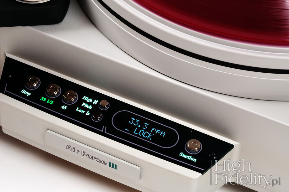 A word about device's control - the engine and sucking are activated by illuminated buttons on a small panel projecting from the front wall. There are two speeds, 33 1/3 and 45 rpm, and one can also fine-tune them using the two 'Pitch' buttons, that offer an adjustment in ± 0.1 rpm. steps. The company offers its own phono cartridges, but does not make their own tonearms - hence the choice of three different ones for this test. This is quite understandable. But I do not quite understand why you have to pay extra for the record weight (3600 PLN). Not only in this case, but also for AFOne and AFTwo. ![]() Specifications (according to manufacturer) Deck |