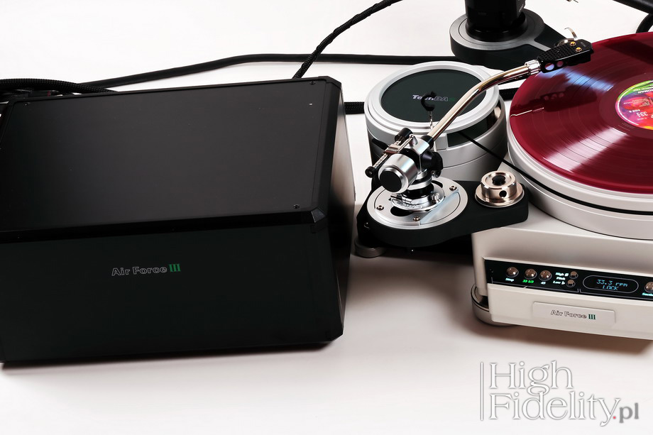 I do not know if it's why, although probably there is something to it, but it seems to be a device that does not mask pups and cracks. When listening through the loudspeakers it did not bother me at all. With the new pressings there were almost no pops and cracks at all. In turn, the magnetostatic handset, HiFiMan's model HE-6, that always reacts nervously to higher treble energy, it was quite audible. Generally, it's a similar level to what you can hear from Transrotor turntables, Acoustic Signature and SME, but more clearly than with suspended decks, as well as with more expensive TechDAS models. …or not to be This is one of the features of the best, most expensive turntables – they separate the music and artifacts related to its reproduction. They place them in separate planes, which we, our brains, do not have to separate by ourselves. With the "Three" they are nicely damped, nothing disturbs the treble, but there is no such "separation" as with the more expensive models, especially with the One that is, in this respect, insanely good. Also, the size of the instruments, the volume of their sound here is smaller. The soundstage is not very deep, although we don't perceive this as a bad thing, because our focus is on the foreground. It is very clear especially with analogue jazz remasters, for example by Speakers Corner or Analogue Productions. This is a turntable that sounds best when playing analogue recordings. Records pressed using digital masters still sound good, for example I like the Dead Can Dance's album Anastasis released on green vinyl (Record Store Day 2016) very much. It took me only a moment, though, with the cited Extra Ball albums such as Somethin 'Else by Adderley or Carter's Jazz Giant, or the beautifully recorded in OBUH studio album by Semaphore Combo group (analog from beginning to end), to know that it was it! One played all the albums in a delightful way, Two played them very well, but it slightly favored analogue ones and Three is simply created for the latter. The sound of more expensive turntables of this producer has a greater momentum, it is unrestrained and more resolving. The '3' tends to shape the presentation bit towards a common denominator. Low bass is not so well defined nor so well controlled. Not to the point it could bother a listener, because it's able to damp impulse quickly, but we know that it could go even deeper with it, that the response of the room could have even greater momentum. Summary If someone says that Three is flawless, he will either lie or be misinformed. More importantly, however, if somebody says about the Three that it is a poor performer will lie more or be even more misinformed. I'll go a step further and say that even those who ostensibly will express their opinion by saying "worse than ...", referring to the more expensive TechDAS decks should think about it, because apparently they do not understand the audio and do not know how to separate the product from its context. Air Force Three is a turntable about a specific voicing that sticks to the paradigm set by the One. It offers it all but to the lesser extend, it is much cheaper after all. This is a beautiful example of precision engineering, in which the music is the key element, the ultimate goal. This turntable differentiates really well without emphasizing flaws of the recording. It responds best to the fully analogue recordings, and they, coming from, for example, Blue Note, Columbia, etc., will land on its platter most often. The focus on lower midrange makes vocals sound fantastic and are three-dimensional. This is a turntable, which has some flaws, which does not do everything perfectly. However, it is a mature, beautiful product, an emanation of human genius at its best. Do not forget that this product can be improved in the future by adding a record weight, a anti-vibration platform, or replacing platter with another one. ![]() TechDAS Air Force III is a turntable of a mass-loader, non-suspended design with a belt drive. Its base has a square outline and is relatively short. It made of perfectly folded, aluminum castings and set on four adjustable feet. They are not decoupled with a pumped air, as in AFOne or by a rubber "cushion" as in AFTwo. Instead, we have a rigid decoupling, with a spike and a bed. The company assumes that in most cases it will be sufficient, but also understands those who might consider this solution insufficient. For them it will be important to know that a pneumatic platform is being develop, a one that in future could be used under the deck. HRS prepared a platform for AFOne and I wonder who has been chosen for this task this time. As I said, the main 'body' is made of 21 kg aluminum die-cast, also a 9 kg platter is made of aluminum. As reported by TechDAS, platters made of different materials are being prepared, and experience learned with AFOne tells us, that a different platter will result in a quite different sound on the same deck. From the top platter is finished with a material improving its engagement with the record, and at the perimeter and in the center it features an outwardly projecting silicone seals. This is a part of the system that sucks record to the platter - I do not know a better way to integrate the record and turntable. The disadvantage of this solution is that it works only for the 12' records. The platter itself floated on a film of compressed air at a height of 30 microns above the disk of a tempered glass. Air for both systems, for suction and lifting, is supplied through a fairly long hose to the back of the turntable. The pressure is generated in a separate system of pumps, housed in the black box. The box is made of aluminum plates and looks like a high-class power amplifier. The box, apart from the microprocessor-controlled pumps, holds also a power supply and a motor controller. Suitable cable terminated with a multi-pin plug runs along the hose from the pump to the rear panel of the turntable. Pumps
