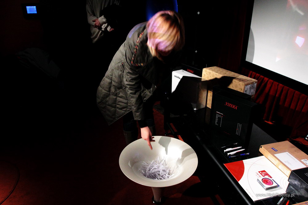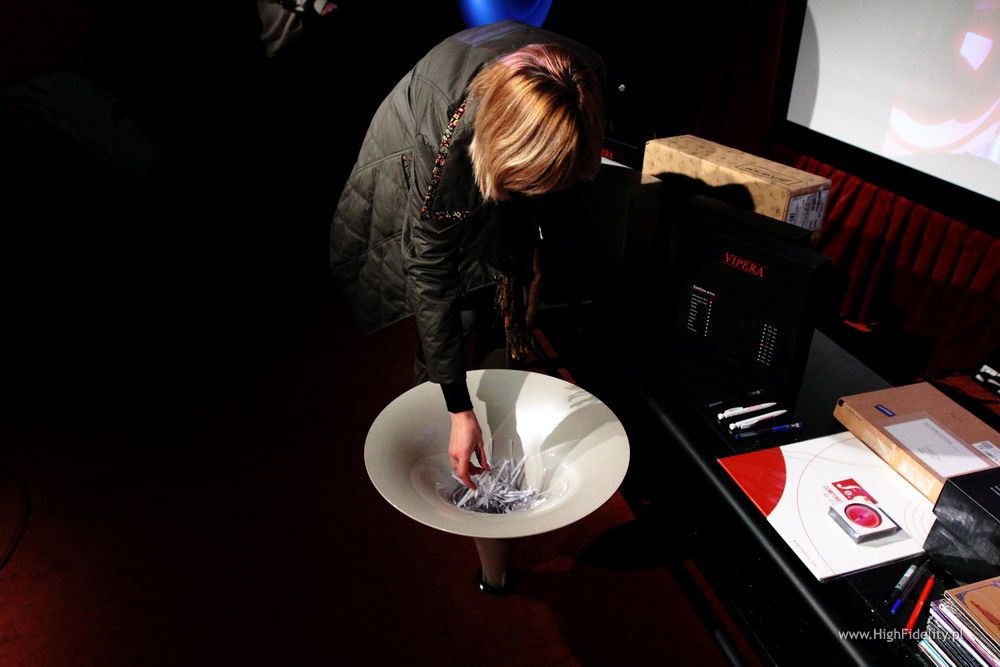 Jak mówiłem w „zapowiedziach” opublikowanych 1. stycznia (TUTAJ), w tym roku nagrody podzieliliśmy na dwie pule – jedną rozlosowaliśmy spośród wszystkich, którzy przysłali odpowiedź na pytanie konkursowe („Która okładka 2010 roku najbardziej ci się podobała?”) i krótkie uzasadnienie wyboru, a drugą pośród tych, którzy przybyli na losowanie osobiście. Ponieważ wszystkie nagrody zostały przekazane przez dystrybutorów i producentów bezpłatnie chciałbym jeszcze raz wszystkim podziękować w imieniu moim i czytelników! Może wydaje się to trywialne, ponieważ wiele pism organizuje konkursy, najczęściej ze znacznie kosztowniejszymi nagrodami, ale tak nie jest –bezpłatne przekazanie produktów na nagrody jest bardzo rzadkie. Zazwyczaj nagrody w magazynach audio są wymieniane na reklamy w systemie barterowym (dystrybutor/producent – nagrodę, a pismo – reklamę) – reklama w piśmie drukowanym jest średnio dziesięć razy droższa niż w internetowym; gdybym pozyskał nagrody w ten sposób, musiałbym je spłacać reklamami przez kilka lat. I częściowo zmienić tryb życia, przyzwyczaić się do mniejszej ilości pożywienia itp.. Może nawet by mi to wyszło na zdrowie… Ale nie o tym przecież piszę: nie ma w takiej wymianie nic złego, proszę tego nie zrozumieć opacznie – chodzi mi tylko o to, że nagrody, które państwo otrzymaliście były prawdziwymi prezentami. I tyle. Dlatego tyle razy wstawiam gadkę o dobrej woli dystrybutorów i producentów. SetupNajważniejsi są jednak ludzie. Konkurs jest oczywiście zabawą, sposobem na interakcję, a także – mówiłem o tym podczas losowania – sposobem na wyłudzenie tylu świątecznych i noworocznych życzeń od czytelników ilu się da :) Nie wypada przecież przysłać w grudniu swojego głosu bez stosownych życzeń – za które przy tej okazji serdecznie wszystkim dziękuję!!! Dlatego też staramy się co roku tak dopasować regulamin konkursu, aby i wilk był syty i owca cała, że się odwołam do ludowej mądrości. I stąd też rozdzielenie nagród na dwie grupy. Pierwszą z nich rozlosowaliśmy pośród wszystkich uczestników. Losowanie odbyło się (już drugi rok z rzędu) w krakowskim salonie Nautilus – „High Fidelity” jest pismem, które może być wydawane w całej Europie, ale miejscem jego rejestracji jest Kraków. Stąd wybór miejsca na losowanie – mam po prostu bliżej. Spotkaliśmy się w większej z dwóch sal Nautilusa, w której postawiliśmy kolumny Avantgarde Acoustic Duo Omega w jasnym, niebieskim kolorze. Wiadomo, dlaczego – na zdjęciu ze zwycięskiej okładki znalazły się właśnie kolumny tej firmy, model Trio. Głównym jej motywem był jednak wzmacniacz Synergy Hi-Fi 6F3, o którym pisaliśmy TUTAJ. Maleństwo mieści się w tubie głośnika wysokotonowego Avantgarde’ów, dlatego to zestawienie okazało się niezwykle nośne. Jedną z cech tego genialnego wzmacniaczyka jest też jego nietypowy, różowo-czerwony kolor, który narzucił okładce stylistykę. A ta przyciągnęła do siebie głosy kobiet. Za chwilę do tego wrócę. Głosy (losy) miały postać długich pasków, „makaronów”, a to dlatego, że były skopiowane bezpośrednio z mojej poczty i wycięte z kartki, na której je wydrukowałem. Przed drukiem dopisałem tylko do każdego nazwiska numer telefonu danej osoby. Makarony wrzuciliśmy komisyjnie do naczynia wręcz idealnego – do tuby średniotonowej (w kolorze złoto-waniliowym mettalic) modelu Trio G2 Avantgarde’ów. Ach – nie mogłem sobie tego lepiej wymyślić! Jeszcze rok temu byłoby to niemożliwe, ponieważ w sprzedaży była wtedy starsza wersja kolumn (G1), w której nie da się w łatwy sposób wykręcać i zmieniać tub. Wersja G2 charakteryzuje się wieloma poprawkami w przetwornikach i wzmacniaczu subwoofera, ale równie ważne są zmiany stylistyczne, takie jak znakomity stelaż, podstawa i właśnie możliwość dowolnej zmiany koloru tub. I właśnie z takiej tuby, postawionej węższym końcem na podłodze, losowaliśmy zwycięzców. A właściwie losowały, na przemian, trzy panie, obecne na losowaniu. Nagrody – odsłona IJest mi więc niezwykle miło poinformować, że nagrody z pierwszej puli, tj. przeznaczonej dla wszystkich biorących udział w Konkursie, wylosowali: Pan Budka Zbigniew – kolumny wolnostojące Monitor Audio Bronze BX6 Pan Robert Kotłowski – interkonekty Oyaide Tunami Terzo RR Pan Artur Stański – interkonekty + kable głośnikowe Vipera Xanthina Series IC (1 m) + SC (2 x 3 m) Pani Iwona Zarzycka – kable Atlas; interkonekt Equator mk2 (1 m) + kabel głośnikowy (2 x 2,5 m) Equator 2,0 Pan Marcin Jarosz – kable Atlas; interkonekt Hyper RCA (1 m) + kabel głośnikowy (2 x 2,5 m) Hyper 2,0 Pan Tomasz Lurka – zwory głośnikowe RAMSES-II SC Y-Adapter Pan Henryk Kraszkiewicz – kompletna dyskografia Rabih Abou-Khalila, artysty wydawnictwa Enja (12 płyt CD) Te nagrody podawaliśmy we wszystkich zapowiedziach towarzyszących regulaminowi konkursu. Mówiłem jednak również, że przygotowałem kilka niespodzianek. Jedną z nich był odtwarzacz multimedialny IcyBox MP3011HW, który wylosował: Pan Grzegorz Michalak