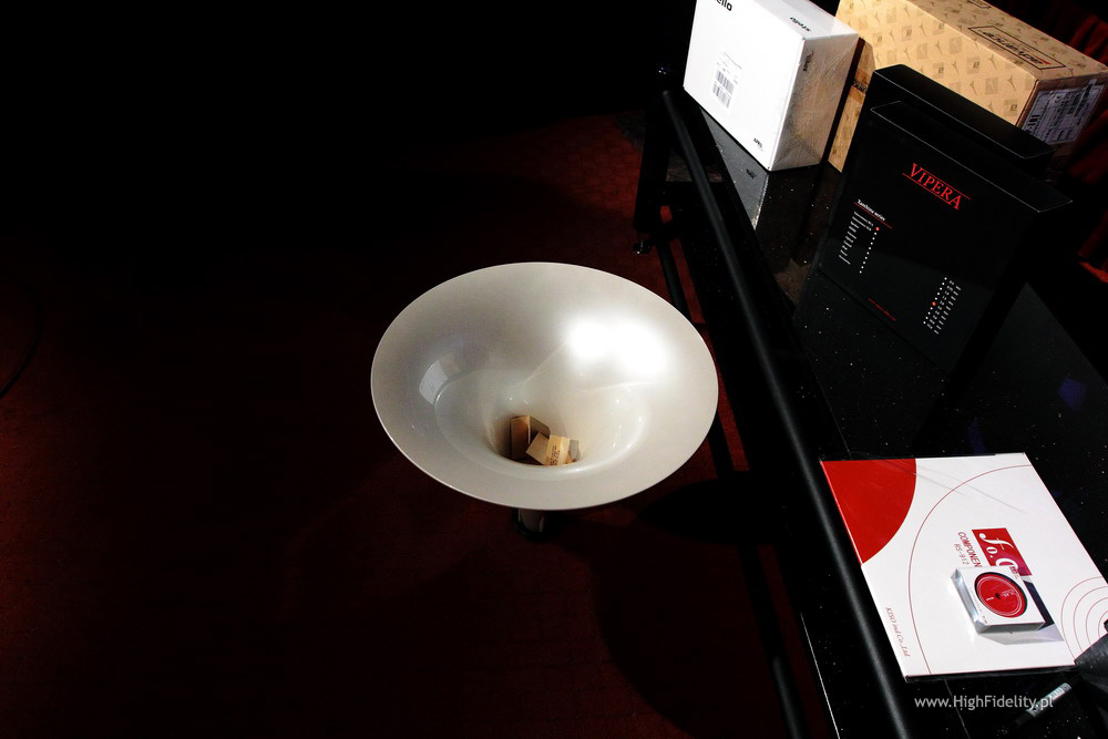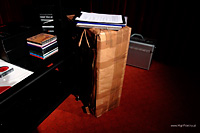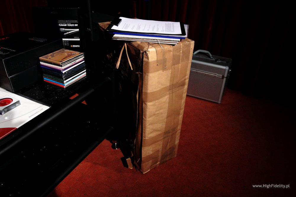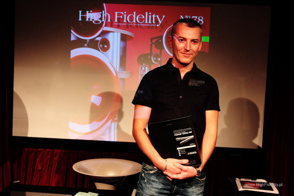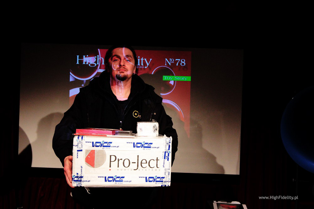 Jak się okazało jeden z obdarowanych był obecny na sali, więc z przyjemnością wręczyłem mu nagrodę – kable Oyaide. Po losowaniu, kiedy tylko dotarłem do domu, chwyciłem za telefon i zadzwoniłem do wszystkich pozostałych zwycięzców z gratulacjami. Nie udało mi się to tylko w dwóch przypadkach – informację o wygranej postaram się przesłać mailowo. Nagrody – odsłona IINo dobrze, pierwszy rzut mamy za sobą. Poza nagrodami z pierwszej puli mieliśmy też pulę drugą – dla tych, którzy poświęcą swój czas i pomogą mi w losowaniu. Ta część była, jak dla mnie, najprzyjemniejsza i budziła największe emocje. Rozlosowaliśmy następujące nagrody: Przetwornik D/A Stello DAC100 Signature 24/96 USB + kabel cyfrowy RCA-RCA Vipera Xanthina Series (3 m) Fundator (Vipera): Vipera Wzmacniacz zintegrowany Advance Acoustic MAP101 Interkonekty + kable głośnikowe Vipera Xanthina Series IC (3 m) + SC (2 x 3 m) Platforma antywibracyjna Pro Audio Bono, wersja SE Podkładka pod płytę LP RS-912 oraz docisk antywibracyjny RS-33 japońskiej firmy ƒo.Q Mata do gramofonów Harmonix TU-800EXi, wersja ulepszona Opracowana przez grafików, wydrukowana na eleganckim, perłowym papierze fotograficznym okładka dowolnego numeru „High Fidelity” z (moim) podpisem i dedykacją Nagrodzonych mogą państwo zobaczyć na zdjęciach. Urządzenia i produkty zapewne najlepiej wyglądałyby rozpakowane, ale większość z nich wciąż była w firmowych opakowaniach, nieruszona i nie chciałem tego zmieniać. Stąd szczęśliwcy z pudełkami w rękach… A będąc przy pudelkach chciałbym zwrócić uwagę na największe z nich, skrywające platformę antywibracyjną Pro Audio Bono. Była ogromna i ciężka, a to dlatego, że producent przysłał najdroższą wersję platformy – grube półki, standardowa wielkość i coś jeszcze… Ale o tym we fragmencie maila, usprawiedliwiającego niespecjalnie wyjściowy wygląd paczki: „Niestety nie mamy dobrych kartonów do wersji SE (dopiero są dla nas robione), Laureat musi więc nam wybaczyć, że zewnętrzna forma jest nieszczególna, za to treść, czyli wnętrze, okazałe. Nie dość bowiem, że dostanie naszą najlepszą platformę, to jeszcze zamiast standardowych nóżek dostanie warte dodatkowo 320 i lepiej grające nóżki z litego mosiądzu. Jak widać od spodu platformy, na bolce o średnicy 8 mm może wkręcić owe nóżki, ewentualnie stopki łożyskowe lub stożki antywibracyjne PAB (także innych firm).” Władysław Skrzypczak (właściciel) I wszystko jasne. Podobnie, jak w pierwszej części, tak i tutaj miałem kilka niespodzianek, z dwiema najważniejszymi. Pierwsza dotyczyła krążka dociskowego RS-33 japońskiej firmy ƒo.Q. Od razu widać było, że dorzuciliśmy do niego matę RS-912 tej samej firmy. To miała być przedostatnia nagroda, w zamyśle – nagroda pocieszenia. Żeby jednak jakoś rozruszać towarzystwo postarałem się o miły dodatek do docisku. Szczęśliwiec otrzymał bowiem do niego resztę systemu: Gramofon Pro-Ject 1-Xpresssion III z wkładką Ortofon 2M-Blue Interkonekt Harmonix CI230 mk2 Przedwzmacniacz gramofonowy MM/MC Linear Audio Research Tak się złożyło, że obdarowany nie miał wcześniej gramofonu. Już ma.