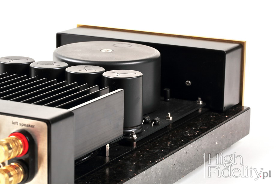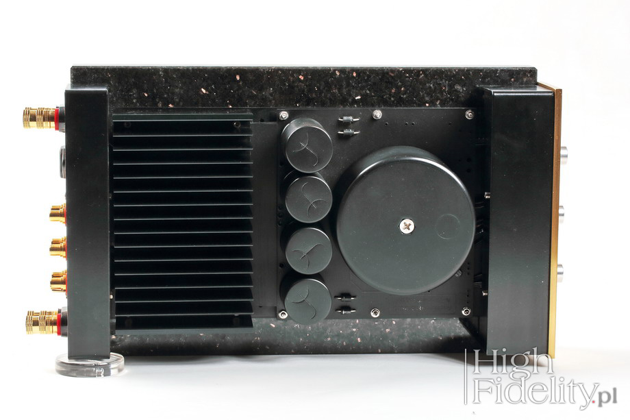 The electronic circuit is divided into three parts. Potentiometer and input switch are placed in a small chamber by the vertical front panel. The second, identical one, located in the back of the device, there are input relays and - in the upgraded, V-Cap version - TFTF capacitors (also OIMP version is also available with oil capacitors). The entire amplifier circuit is located under the backside of an aluminum heat sink. What is known about the design is that it is a solid-state one, it features coupling capacitors, and that has been assembled using point-to-point assembly, without a printed circuit board – another reference to high quality tube amplifiers. Since such type of montage is time and effort consuming it is rarely seen in solid-state devices. The heat sink heats up quite a bit, but won't burn you if you touch it. The system features thermal protection and if the temperature exceeds 70 ° C, the amplifier is switched off. I think that no relays were used for speaker outputs, because when you turn off the amplifier you can hear a muffled "poof" in your speakers. The unit is nicely made, but not as precisely as amplifiers offered by large companies. The radiator, for example, has uneven edges, and screws used to fix power supply and transformer surely do not contribute to this amplifier's appearance positively. And these rubber feet ... ![]() Technical specifications (according to manufacturer): Output power: 2 x 70W/4Ω | 2 x 40W/8Ω |