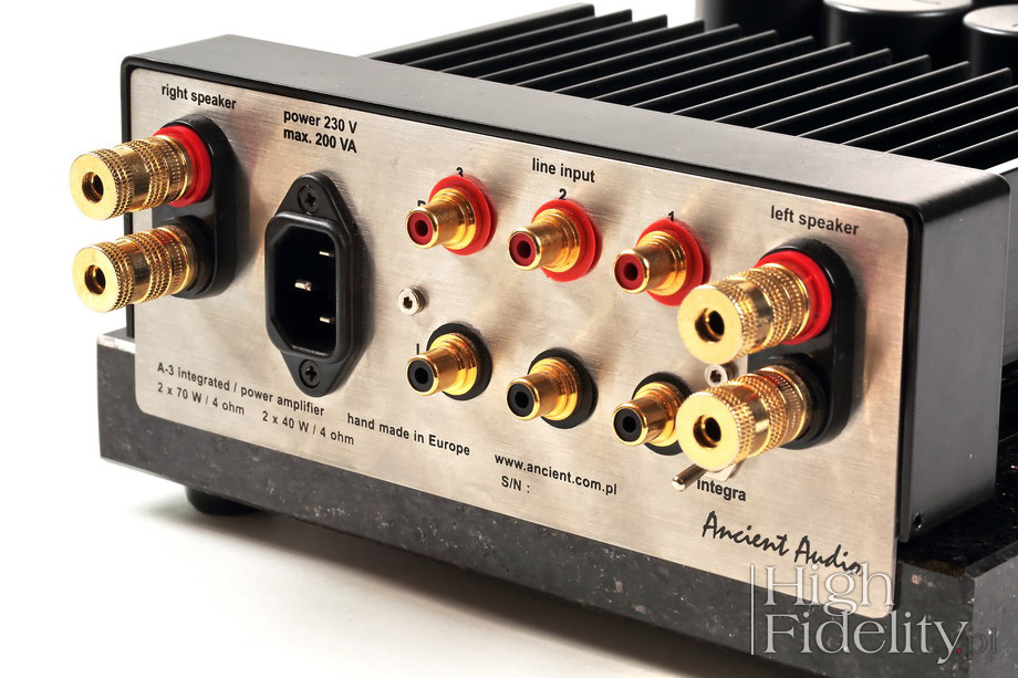 If something were to change in this perception of the brand, the A-3 is a step in the right direction. This amplifier generates a big sound. With both, my Harbeths and Trenner & Friedl Osiris I received a beautiful depiction of what has been recorded on CDs from my collection and it was done in a way that ignited true emotions. The main feature of the amplifier is fullness of its sound. That's something one sometimes hears delivered by good tube amplifiers, and sometimes by good solid-states. This degree of saturation, we have with A-3 however, is usually a quality of much more expensive products offered by brands such as: Lavardin Technologies and its IT-15 or elinsAudio Mille. The instruments have proper height, depth and width, have distinct bodies surrounded by other distinct elements of the soundstage. Changes in the dynamics and tone clearly influence our interpretation of what we hear – they don't exist for themselves, nor distract our attention from the music. The sound is dense, rich, saturated. There is no trace of aggression, because there is no emphasis in treble nor upper midrange is accentuated. I would call it a “warm” sounding amplifier because it is not 'warmed up', but it should fulfill expectations of those who search for a warm sound, and still would like to have something more than that. "Something more" in this case will be a resolution. This amplifier reacts to all changes introduced to the system, to differences between recordings, showing them in a clear, direct way. But it's doing it “casually”. It does not focus on the recording techniques. It differentiates tone, soundstage, dynamics only in conjunction with the presentation, never just next to it, or instead of it. All this adds up to the "beauty" of this presentation I started my description with. A-3 in a very comfortable way takes us to another world, generating deep, low bass. It is not so well differentiated, as midrange and treble are, and even as the upper bass is, but on contrary to what we got used to, it is fantastically controlled. It is a rare case that these two features occur together, because the soft, not quite so well differentiated bass is associated with this 'boomy' effect, with insufficiently fast beginning and ending of each sound. Ancient behaves in this regard as some much more powerful devices, reminding me what Naim amps do. Yet, Polish amplifier does not deliver particularly taut or contoured bass notes as the English amplifiers do.