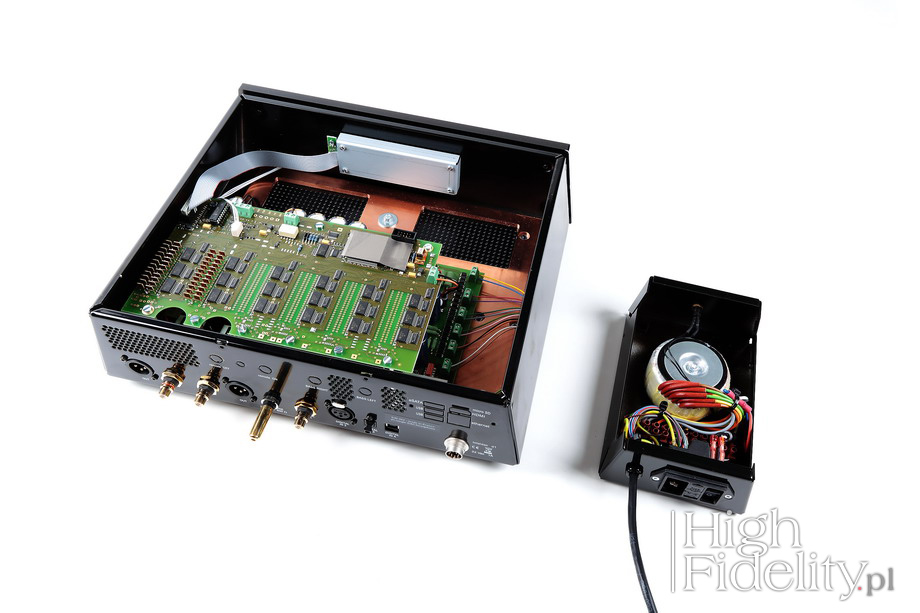 Such, for example, "DAC" - on one hand, we know what it is, if only we have anything to do with audio, on the other... DAC stands for "Digital to Analog Converter". However, it actually has two meanings: it's a means to convert digital signal to its analog form, usually a small chip, and the second meaning is the whole device used to convert digital signal to analog one of which this small chip is the main component. Hence we are talking about two different things here. DAC for a common man DAC which is an element (chip) converting digital signal to analog and it is a part of the device that converts digital signal to analog. But in order to being able to convert signal and make it useful for the audio system, "Dac" has to be surrounded/supported with other circuits and components. Typically, in the input stage there is a digital receiver. Almost always it is a chip of one of the specialized brands, such as: Burr Brown, AKM, Analog Devices. Sometimes a programmable DSP is used instead with its own software written by the DAC's manufacturer. The receiver works as sort of “interpreter” of the input signal for the DAC chip. If the device features USB input it is followed by a specialized receiver that converts USB signal to PCM, which is “understandable” for the D/A converter. Often, especially in recent times, between the receiver and the converter one places digital filters, for example, upsampler ("Sample Rate Converter") that converts 16-bit words to 24-bit (this is how the K2 used by Reymio works, as well as the Advanced al32 by Denon), or to DSD signal, or, finally, a DSP with implemented filters. DAC is also almost always a chip from one of the above listed expert manufacturers, that was joined few years back by the current leader of the market, the ESS Technology with their SABRE32 DAC. This is an eight-channel system, ready for use in multi-channel systems, which can, however, be turned into a stereo one, by combining four parallel channels. This provides a significant reduction in distortion, higher signal-to-noise ratio, etc .; Accuphase, for example, achieves the same using a few, stereo chips. After signal is converted in DAC it is further processed in the analog domain. First, the current signal is converted to a voltage one, because it's the only kind "understood" by the preamplifiers and power amplifiers. This is called a I/U converter, or a current/voltage one. Usually these are active systems, but sometimes the purist designs feature passive one. And finally there is a gain section and output buffer reducing output impedance. This section is made either by means of integrated circuits, or transistors, or tubes. At the very end of signal's path there are output jacks. As you can see, the possibilities are plenty, and apart from the said DAC section there are also other elements, such as: oscillators, power supply, enclosure, assembly and so on – a designer must demonstrate creativity, skills, and have his own idea; he can make mistakes in each of the mentioned elements. d1-single-mk2 d1-single-mk2 is a digital-to-analog converter with variable output (in the digital domain). It is a simplified version of d1-six - instead of three, working in parallel, discrete converters per channel, there is one. This is an unbalanced device and in the XLR output only the “hot” pin is active. But the idea is the same as for the other converters of this brand: instead of a small of-the-shelve chip from an external company, designer uses discrete circuitry, with precise, metalized resistors, switched by integrated circuits. This is so called: R2R DAC. The signal is prepared for it by a programmable DSP, that performs re-clocking and that also features (two) digital filters, including one without oversampling. The user can choose which one suits him best. The digital signal can be delivered to DAC using one of the four inputs, including the asynchronous USB. All of them accept PCM signal up to 24 bits and 192 kHz. Manufacturer offers an optional DSD (DoP) functionality for all inputs at extra cost. In fact there are even more options available: