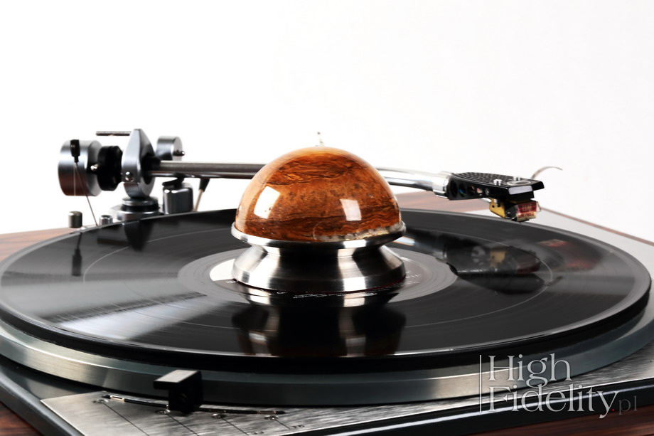 An element added by Nomos that immediately catches the eye is the record clamp of the semicircular shape and specific appearance. It was made of decorative stone and it is very heavy. It features a layer of a red cloth on the bottom, which resembles the materials used for turntables already from the 1920s. The placement of the tonearm is atypical – it is not mounted on the side but in the back of the turntable. As the guys from Nomos told me, the idea was to achieve a maximum decoupling from motor generated vibrations, and the lowest level of vibrations was found at the back of the chassis. Initially, it seemed bizarre to me, but it turned out that this location was very convenient to use. The tonearm featured the Elac DN 795 E cartridge with the original stylus; One can also order it with a modern production needle.
