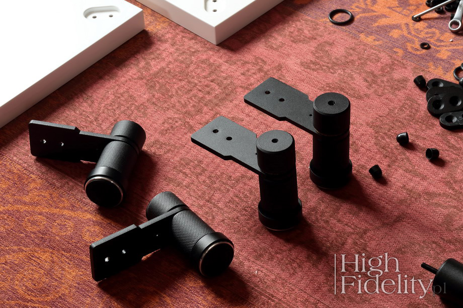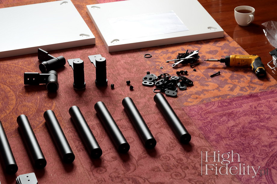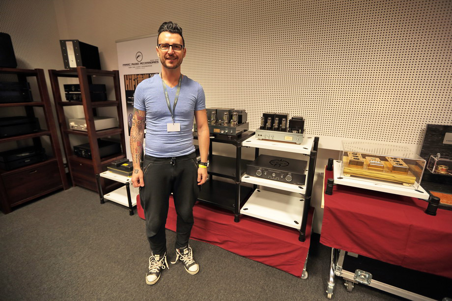 The Franc Audio Accessories emerged on audiophiles' radars in 2008, from the very beginning with a refined product - Ceramic Disc anti-vibration feet, which, after introducing various variants, were re-named to Classic. Perfectly made, well packed, they changed the sound of the devices and speakers placed on them and it was surely a desired kind of change. I quickly became an owner of three sets and since then I have been using them as a decoupling elements for my CD player, preamplifier and for the various devices I have tested over the years. To say that I used them with no less than 200 different products would be quite conservative. And they never let me down. A natural way for company's evolution was to develop anti-vibration platforms, which we reviewed once with the Krakow Sonic Society. After a few amendments these found their way to some very expensive systems, and the Polish distributor of Soulution brand used them at exhibitions under 701 power amps. And since company already offered platforms, why not a whole rack? That's how the Wood Block Rack came to life, combining the advantages of several Ceramic Disc feet, the Slim and Fat Wood Block platforms, and the specially designed frame for them. And finally, it was time for OEM production, providing specifically for this occasion developed Tablette feet, used, for example, for Amare Musica products such as Diamond Tube DAC DSD . Modular, or how I put a rack together It is seems obvious that Paweł Skulimowski intended his products to music lovers who could afford to spend a lot of money on audio. But a time came to create some more “for the people”. To do that Paweł came up with an idea of a modular rack that could be used also by beginning audiophiles and which - importantly - could grow with them or their systems. The concept itself is not new, let us remind you that the same is behind the Rogoz Audio 5SMX12/BBS rack, but for some reasons this one is particularly interesting. The Modular system is supposed to be as cheap as possible, to be delivered to a customer packed in a flat box, that reminded me of IKEA furniture boxes, and to be simple to put assembly. I mentioned the name of the Swedish manufacturer, who changed the way we think about furniture, on purpose and expect its appearance a few more times in this test. And indeed - the courier brought to the 3rd floor a medium-sized package without much sweat. Inside the box there was a smaller size box, say, an extra large pizza - say, five of them stacked on top of each other. Inside I found carefully placed elements: at the bottom three shelves, and on top of them feet and bolts together with elements to fix shelves. The ordered rack was to consist of three levels. The Modular's design is pretty simple. One can start one's adventure with it with a classic anti-vibration platform, eg for an amplifier. Its base is a board of varnished MDF, to which in the four corners we screw up the aluminum booms. Each of them are screwed together with two screws, pulled through the board and reinforced from the top with an aluminum pad. The nuts visible from the bottom are covered with rubber "cups". In the other end the booms feature a drilled hole which is put over a screw screwed to the bottom foot. This is an anti-vibration foot, consisting of an aluminum cylinder and Tablette pads. The latter are adjustable which allows to level the rack. In the milled hole of the foot one presses a rubber ring, which decouples the two elements. From the top the boom is fixed with a knurled nut. A cork insert is placed between the nut and the boom. The whole operation takes about 20-25 minutes and one has a lot of fun (or curses as hell) same as with IKEA products. With the kit one receives an illustrative drawing from which most of the necessary actions can be deduced, but a more detailed instruction could be useful. The set includes an Allen key and a wrench. One has to use both of them to tighten the bolts properly, as the stability of the rack will depend on it. The basic platform consists of 57 elements - 14 for each corner plus a top. This basic top has a company logo attached. If one wishes to extend the platform to a small rack, four aluminum legs need to be tighten from the top, and four booms and board – the process is the same as with a platform assembly. Between the legs and the booms there are rubber rings, pressed into the milled groove. The crimped screws, previously bolted to the platform, now serve to close the table from above. The table can have two, three, or even four shelves. It can also be extended to the side so that we can place two devices side by side.  PAWEŁ SKULIMOWSKI   Paweł Skulimowski during Audio Video Show 2016, and behind him you can see the first version of the Modular rack; an interesting fact - Paweł designed his tattoos himself… The goal was straightforward: I wanted to make something visually simple and not as expensive as my current exclusive Wood Block line. This didn't mean though, that it was supposed to be something "Made in China". I guess everyone knows that it's not what I do in Franc Audio Accessories ... In Modular I used materials and technical solutions, of which I am sure they work, that proved themselves (in my other products) and that were highly acclaimed by many reviewers and a whole lot of customers in Poland and abroad. I used, for example, ceramic Tablette feet, which are, for example, a direct insulator of shelves in my top Wood Block Rack and in all Wood Block platforms. So I didn't go cheap here. As for the quality of the above mentioned "Tablettes" - just have a look at my website to the OEM tab and check the constantly expanding list of companies that use them for their devices.   The shelves are made of lacquered MDF, CNC machined. The same applies to all other elements of the rack. I spent a lot of time refining isolation aspects and finish, so all screws are hidden from an eye so that the rack looks clean and neat. I th