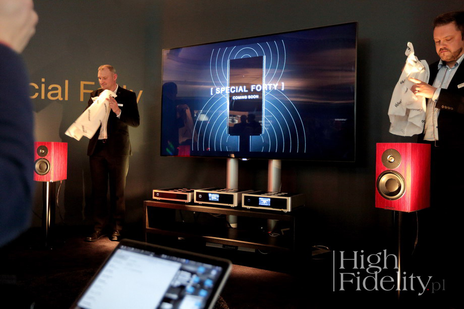 I will start with a presentation that I was late for and only managed to take a picture of the Stern model through glass – I am talking about the Audionet Stern preamplifier and Heisenberg power amp. I talked to engineers later and got some literature, so I know something about the devices. They are intended to become top high-end products, embodying all of the company’s knowledge. Apart from a lot of interesting system and mechanical solutions, it is worth paying attention to the design, which almost always constitutes the weakest aspect of audio devices. In this case, the person responsible for the look is Hartmut Esslinger from the Cupertin studio, one of the most famous German designers who had worked for Sony and Apple, among others. It was a good idea – Heisenberg got the National Design Award, one awarded in the USA to the best designs, and then his work was exhibited at the National Gallery of Art at the Smithsonian Institution. The devices look amazing and produce organic, almost warm sound. I must listen to them at my place, but I can already say that they are the current top high-end. Dynaudio SPECIAL FORTY
