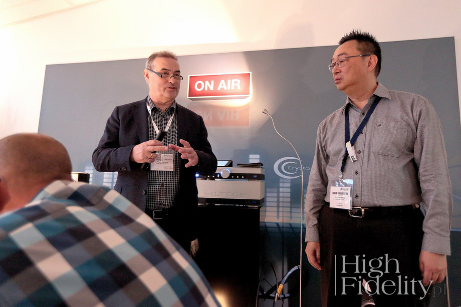 The CEO of Siltech, Mr Edwin van Kley (a member of the Krakow Sonic Society) and the presenter, Mr Lincoln Cheng, the editor-in-chief of the “Audiotechnique” magazine published in Hong Kong. However, the presentation that I participated in included both cables and electronics (the Crystal Cable Integrated amplifier and the Crystal Cable Minissimo Diamond speakers with a special top, minimizing diffractions) in the background. The sound source was the dCS Vivaldi transport with an external clock. The main theme of the meeting were so-called “glass discs”, i.e. CDs made not of polycarbonate (ordinary CDs) or plastic used for LCD production (SHM-CDs and HQCDs), but of glass. The production of such CDs is very expensive and time-consuming, so they cost a lot – from 2000 to even 6000 PLN per CD! The presenters were: Mr Edwin van der Kley (Siltech) and Mr Lincoln Cheng, the editor-in-chief of the “Audiotechnique” magazine published in Hong Kong, the owner of the CDs. As he told me after the presentation, he has 45 of them... However, it was enough to listen to an ordinary version of a given CD and to its glass counterpart just for a moment to understand the whole thing and see how much is lost between the mastering studio and the consumer. It is a thing that I have been repeating for years, presenting Master CD-Rs burnt at a studio. Glass discs have incredibly filled sound and a very silent “background” – it seems that their sound is velvety and soft, but only because we get plenty of information. In contrast to them, an ordinary CD seems to be very euphonic and colored.