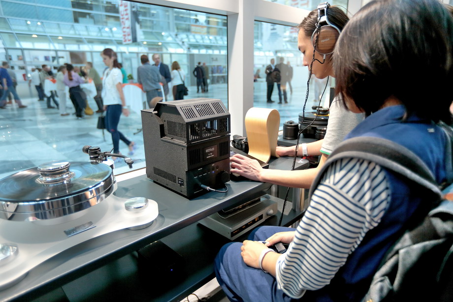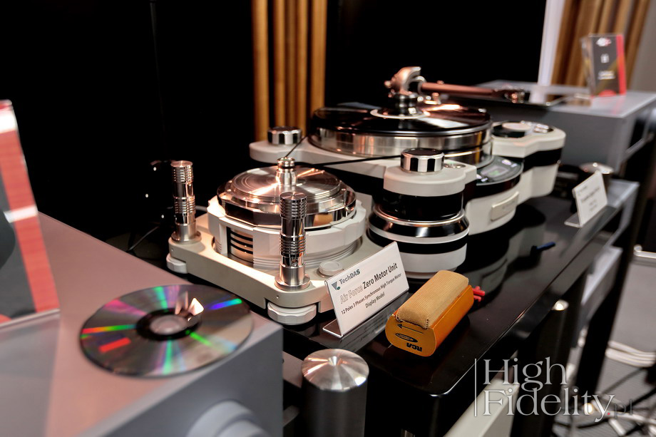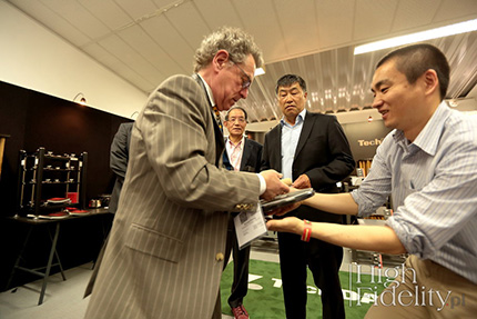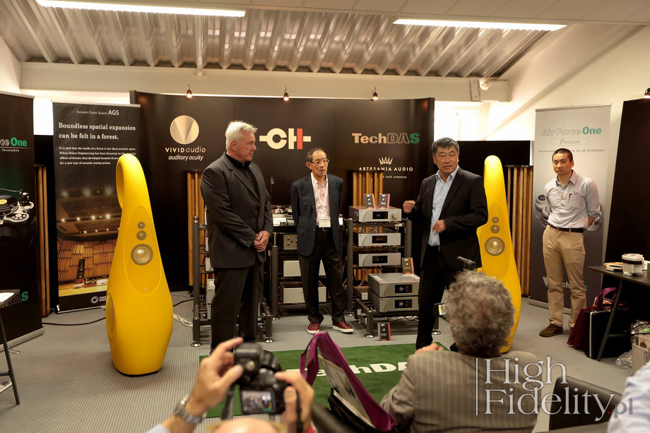 However, in an alphabetical order, the last of the four described presentations, held by Mr Hideaki Nishikawa, the head of designers, opened the whole exhibition. On Thursday, the day intended for the so-called “industry”, at 10 o’clock I sat in the first row next to Michael Fremer (“Stereophile”), with Ken Kessler (“Hi-Fi News”) on the left and Robert Harley (“The Absolute Sound”) behind. The topic of the presentation was supposed to be the latest and the most expensive (two times more costly than the Air Force One) turntable from the Japanese company TechDAS. The presentation was untypical in the sense that Mr Hideaki Nishikawa talked in Japanese, which was interpreted into German by one of his colleagues and from German to English by our friend, Volker Bohlmeier, the owner of the Einstein company and the German distributor of the TechDAS brand.