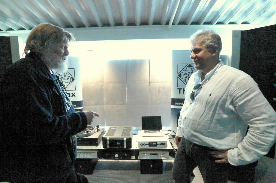 - Mr Paul Messenger, the editor-in-chief of the “HiFiCritic” magazine, on the left and Mr Rumen Atarski, the owner of Thrax Audio, on the right. Between them there are new integrated amplifiers – a transistor one on the right and a tube one on the left.