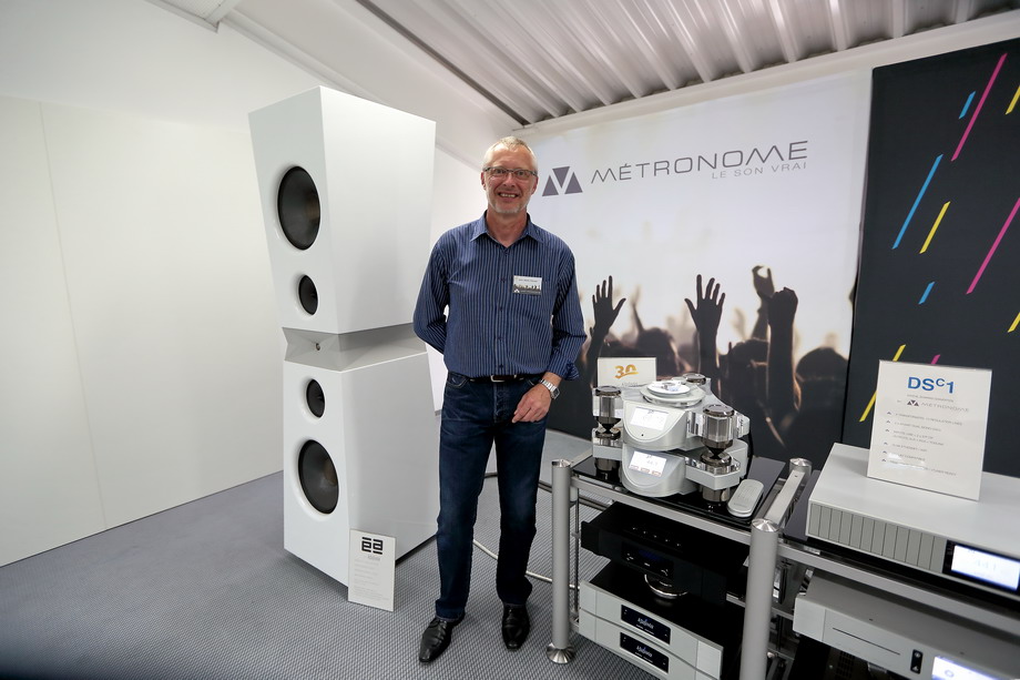 - Mr Jean Marie Clauzel, the CEO of Métronome Technologie, next to an enormous new speaker that he designed. This year, the company is celebrating its 30th anniversary!