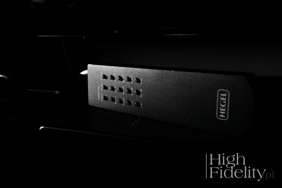 The analogue section is surface-mounted, and it features WIMA polypropylene capacitors. The preamplifier section utilizes integrated circuits, including the integrated HRC NJW1159 resistor ladder. It is integrated into the output buffer, so the preamplifier itself can be very simple. The headphone amplifier is based on a single JRC4556AD chip and several surface-mount transistors. The power amp section is completely solid-state. In its input one finds blue elements that once we would have called “thick-chip integrated circuits”. They are labeled SE3090 with Hegel logo. I guess that these are the SoundEngine2 chipsets. In the output work pairs of Sanken's transistors per channel, that operate in the AB class in a push-pull mode, and are bolted to a large heatsink. On the same PCB there is a power supply section with six large filtering capacitors. The voltage is supplied from a large toroidal transformer with several independent secondary windings. The analogue PCB is made of a thicker than usual copper layers. | Remote control H190 is controlled using the RC8 remote – a metal, solid unit with small push-buttons. They allow user to control not only Hegel amplifier but also their CD Players. Additionally it can be used to control playback of music files. It allows user to turn off the display, switch the “mute” function on/off, set on of the analogue inputs to work as so called „pass through”, which comes handy when combining Hegel with a home theater system. It's a damn good machine! ![]() Technical specification (according to manufacturer) Nominal power: 2 x 150W / 8Ω | 2 x 250W / 4Ω |
