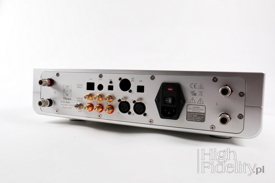 Ares premiere during High End Show 2017 in Munich. The DAC module is a differential implementation of an r2r industrial chip. It also accommodates the clocking for all of the above. This way we have all devices operating from the same clock as slaves (except AES/SPDIF/Toslink) assuring jitter free data transfer and conversion. The core on the input board is configured via software to supply the DAC with correct data rate and format for the specific DAC used. So as an example if you feed DSD signal via the USB input it will be processed and converted to PCM to supply the r2r dac chips. There are a bunch of hidden features for the future as well. We had to draw the line somewhere as this is intended to be affordable :-) The board being too complex proved that software and deadlines are incompatible, so we will start delivery of the digital boards end of this month. MODULES While expanding Ares' functionality, we have three options, classic ones for the end of the second decade of the 21st century: the MM / MC phono preamplifier and the digital-analog converter, and once we have the latter, we can also add an audio file player (streamer). Both modules are actually full-fledged systems. After they are integrated with the device, the functions available for them appear in the menu on the large TFT color display. Only the headphone amplifier is missing to complete the system.The phonostage allows adjustment of gain and loading and it's powered with a separate regulated PS, independent from output stages' power supplies. As Rumen says, the first prototype was a V/I converter based around an TI opa861 chip but the limitation was voltage swing as the chip worked with just 5V. It was great but unusable, so we went back and did the following: As this is an integrated and it is not supposed to be used with a Kondo Io cartridge with 0.1mV output we designed the input around another TI opamp the opa211. We vary the gain and the loading by switching resistors around it. Then the second stage is the RIAA correction using another opamp (not to be disclosed device) implemented half as passive filtering and half in the feedback loop of the second opamp. All this was carefully planed to keep maximum headroom for the signal. The amplifier can be controlled either by means of buttons on the front panel or by a small, nice Apple Remote. The buttons on the amplifier are integrated in black acrylic plate, which also covers the mentioned display. Actually these are not really buttons, but sensors, because it's enough to touch them to trigger a reaction. The display is excellent and is a response to the needs of music lovers in their forties, because the letters and numbers are really big on it. With no modules installed, we can read the volume level and the selected input on it, and in the menu we will be able to adjust balance and access the "learning" mode of the remote control. The volume level is controlled via two buttons - I will stick to that name - with horizontal arrows, which is a different solution than used usually. It will take some time for you to get used to changing the inputs - first, you touch the arrow button, the name of the selected input appears at the bottom of the display, and then you confirm the selection with another button. Therefore, it will be much easier to control it using remote control. This one can "learn" commands, i.e. you can assign them to specific buttons. In the unit we received for the test the standby mode was hidden under the start / pause button. HOW DID I LISTEN The Thrax Audio amplifier was tested in the „High Fidelity” reference system and compared to Ayon Audio Spheris III preamplifier and Soulution 710 power amp. Both drove Harbeth 40.1 loudspeakers placed on Acoustic Revive Custom stands made for me by Mr Ken Ishiguro. In both cases I used Acoustic Revive SPC-3.0 Triple-C speaker cables.
