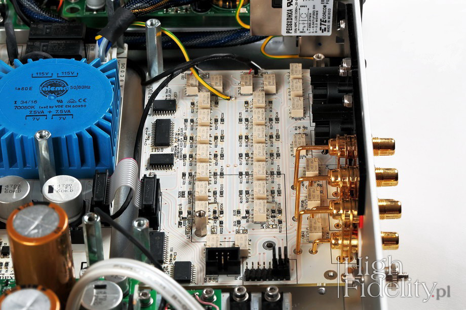 In general, I don't like compilations, but with few exceptions - this material was remastered a little differently than the other releases of the French artist, because it sounds lower, deeper, more emphasis is placed on the midrange. Perhaps this is why, but also thanks to Ares, the sharp edges of treble did not hurt my ears, that are usually particularly annoying on the Zoolook, nor was the nerve lost, thanks to which the Magnetic Fields sound so well still today. I went on and using the Lumïn T1 file player I listened to the track recommended by the editors of Tidal in the "Top 20", including: Post Malone and Rockstar, Camila Cabello and Havana, ZAYN and Dusk Till Down and also Llama In My Living Room by AronChupa. These are all recordings characteristic for formatted radio stations, e.g. RMF FM, Radio ZET etc., also known from music clubs - in other words, listened to by millions. Ares played them in a very pleasant way, because it was warm, without a hint of sharpness and brightness, with a strong bass, which was certainly supported by Lumïn's own sonic character. But it was also a presentation that would not please everyone, certainly not those who know these recordings from a car radio. There was no aggressiveness, no sharpness, not even a proper drive. On the other hand, they finally made sense, because music – I'm talking about successful songs - was complemented with words, I listened to this music in comfort. Of course, it was even better with "Masters" recordings, i.e. encoded in MQA, especially 24/192, but even these did not change the basic structure of this sound: encouraging, slightly warm, soft. I treat all these terms as compliments, these are the advantages. If we are looking for relaxation in music, we do not want to race with anyone, only such type of presentation will fulfill such expectations. The more so because the amplifier does not slow down music. As I showed at the beginning, with recordings in this respect flawless, this device presented a very good dynamics. So if the pop recordings sounded in this way, it was because some distortions that in their car systems created their "identity", their sound, were removed from them. It is also an amplifier that delivers rhythmic bass. It goes deep, it is rich and dense and more powerful than in the reference system. Tidal sounded very seriously, deep, especially from good MQA 24/192 recordings, like Neal Young and The Eagles. And the CDs and SACDs played from Ayon sounded even better. It was a full-blooded sound, a bit warm, but always intrinsically organized and attentive. There is of course the possibility that something will disturb you, the bass will not resound too quickly etc. I will say it only once: Ares will only show the problem of the system, or room, it will not be its "fault". Yes, the tonal balance is shifted down the band. It's just that kind of sonic character. Summary Ares is an amplifier for people who know what is important in life and who do not have to chase anything anymore, struggle with anything - or at least that is how they would like to live like. It delivers a mature, smooth sound, as the MOS-FET based amplifiers used to. It is resolving and dynamic, and being warm it is not closed from the top. It "remasters" poorly made recordings, which will lose "nerve". In return, they will make sense. The device is well-built, features great mechanical as well as the electrical design. Also, it is a modular construction. This is an expensive amplifier, but it's difficult to stay indifferent to it. Well deserved RED Fingerprint należy się i już. ![]() Ares is a heavy device and it's as heavy as hell. And this is primarily due to the “armored” aluminum housing, as well as two solid power transformers. The housing is actually made of two blocks of aluminum, milled from the inside, working also as heat sink. The amplifier produces a lot of heat and you have to ensure a lot of free space around it. It stands on four small aluminum feet. Front and back The main attraction at the front panel is the large TFT display. It displays the volume level and selected input, and in the streamer mode, the album cover and information about it. On both sides there are three buttons, which change the volume, input and allow entering menu. They are marked with icons known from computer devices, sych as streamers. On the back you will find see very nice, gold-plated, comfortable to use loudspeaker terminals and two sections of inputs. Above there is a digital section - in the tested version, unoccupied - and below an analogue one. If you choose to add DAC and streamer cards, the slots will show the sockets for the digital inputs: coaxial, BNC, AES / EBU and USB, and next to them also LAN (RJ-45). Analog input sockets are permanently present - three unbalanced RCAs and one symmetrical XLR pair. The RCA line 1 input can be converted to a phono input, so there is a grounding terminal next to it. The IEC power socket is connected to the fuse socket and the mechanical mains switch. Inside The device is truly minimalistic, but at the same time well thought out. High quality input sockets have been soldered to a PCB with an attenuator. This is a discrete attenuator with surface soldered resistors that are switched in relays; at each level of the volume there are only two resistors in signals path - serial and parallel. Switching the relays is executed by two ULN2803 integrated circuits from Texas Instruments. The preamplifier is powered by a separate power supply, which it shares with the display and logic circuits. This whole section carries a signal in a symmetrical form. After the signal is attenuated, it is sent to the power amplifiers with short balanced cables. The one for the left channel runs along with the power cables. The power amplifiers have separate power supplies, which are placed on the same boards - this is a dual mono circuit, because each output stage has its own (toroidal) transformer supplying symme