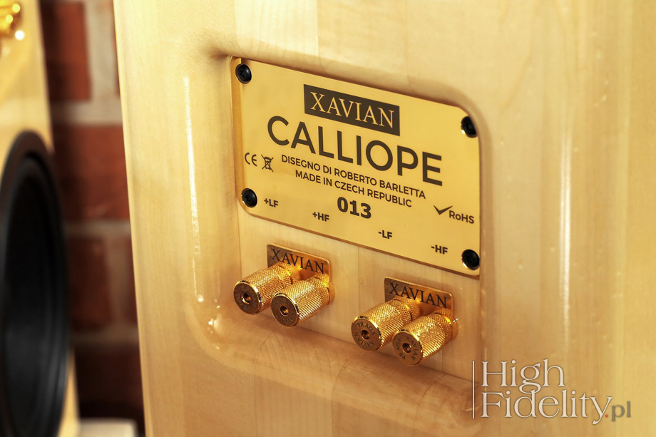 In the XAVIAN case this is all the more legitimate, as its owner and chief designer, Mr. Barletta, is an Italian. He chose Prague as a place to live in, and whoever visited the capital of the Czech Republic and Rome would probably confirm that both cities have much in common, especially when it comes to the way of live. Besides, both cities are considered "separate beings" in their own countries, i.e. there is Prague and the rest of the Czech Republic, Rome and the rest of Italy. | EPICA CALLIOPE Calliope manage to attract attention before they are even unpacked. Well-designed plywood boxes prepared for their transport with logotypes, inscriptions, etc. that were burned out on them are impressive, as well as a complete, detailed unpacking instruction. And the speakers themselves? - When they were brought into my room and set up they immediately attracted attention of all household members. And that's because they look fantastic. Natural, beautifully finished wood, black matte surfaces of the drivers' cast baskets, gold-plated nameplate and, above all, travertine pedestal integrated with speakers, they all combine into an ultimate quality. The speakers are available in two color versions – light one - maple with walnut inserts called Marina, and dark one finished with walnut. The former is placed on an Italian travertine, a type of limestone with an interesting pore system, and the latter on Czech marble. | Cabinet The cabinet is made of wooden staves, which immediately sends us back to the Italian culture of carpenters - previously seen in Chario, Diapason and Sonus faber loudspeakers. And it is the latter, at least that's my impression, and more precisely the Franco Serblin and his vision of form and sound, that inspired Mr. Barletta to create the new Epica series. As it reads in the company materials, the development of Calliope took Xavian designers a year and a half. In the case of many other products, I would accept knowing that it is probably an exaggeration, but not being able to prove otherwise. The case of Calliope is different, because especially for this series, they worked not only on the loudspeaker as such, but also transducers for it were developed. Yes, after many years of cooperation with the Danish Scan-Speak, Mr. Barletta decided to develop his own drivers. For this purpose he founded another company called AudioBarletta. So in this case a year and a half seems to me a very short time. | Drivers The tweeter is a soft dome with a diameter of ø 29 mm, with a hand-coated diaphragm made by Dr. Kurt Müller and a unique way of damping pressure from its back side - in a labyrinth Companies such as Bowers & Wilkins and Vivid Audio use tapered horns for this very purpose, often open at the end, but I have not seen a labyrinth housing for the tweeter dome yet. The magnetic system features copper rings to improve the coil's linearity, a solution known as Faraday's rings. The midrange and bass woofers have the same, very solid baskets. They are fixed to the cabinets not with four buts much as eight screws, which recalls what is emphasized in the Magico technical materials by Alan Wolf - an importance of a perfect connection between transducers and cabinets. The diaphragm of the midrange driver is made of hand-coated cellulose, and in the middle there is a polymer phase cone. The suspension is almost flat and is made of cloth - exactly the same as in high-sensitivity driver from the first half of the 20th century. The driver is driven by a neodymium magnet with copper rings. The bass woofers were originally developed for the Orfeo. Their membrane is also made of coated cellulose, but has a slightly different surface. The suspension is a double rubber fold. | Crossover The Calliope crossover features Mundorf capacitors and uses the "Fase Zero" technology, aimed at phase alignment of the transducers at the crossover point. The custom-made speaker terminals are placed on the rear panel and placed below a large, gold-plated name plate. These are double terminals so manufacturer provides user with gold plated jumpers. One can use single speaker cable, or try bi-wiring, or even drive the speakers with two amplifiers – so called bi-amping. The loudspeakers premiered during Audio Video Show Prague 2017, and received the High Fidelity „Best Sound” award. ![]() Recordings used for the test (a selec- tion):