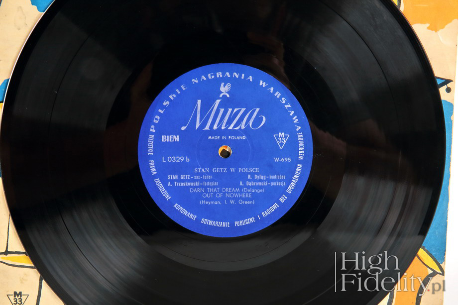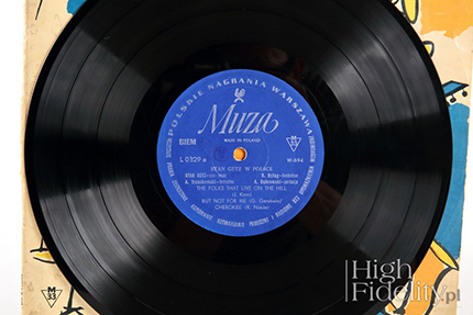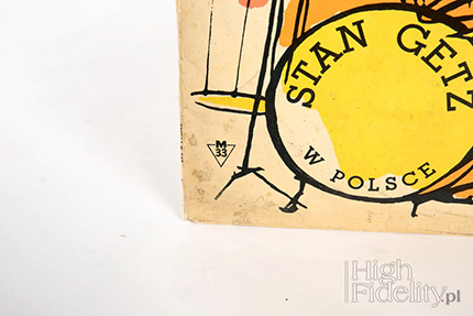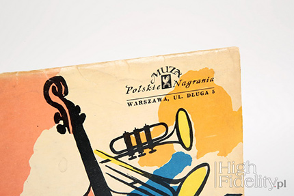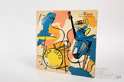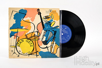 There are five tracks on the album, although we know that more were recorded. The selection was made by Getz himself - Roman Waschko writes about it in the note placed on the record's cover, it is also confirmed by Krystian Brodacki. Waschko also says that the musician listened to the tape after a few days, and that means he had to take copies of them with him to Denmark. It would be an extraordinary event if someone found them and released the full session! | Release The record with the catalog number L 0329 has a diameter of 10" (25cm). It was pressed at the factory of Polskie Nagrania, the former Muza pressing plant. It utilized mainly pre-war machines that were on the verge of collapse. The company called Zakłady Fonograficzne "Muza" was founded in 1947 on the basis of a pre-war company of the same name. A year later, they were transformed into Warszawskie Zakłady Fonograficzne. Because they did not have a tape recorder, the recordings were made on 78 rpm wax plates. In 1955, the company was transformed into Polskie Nagrania (Polish Recordings) and began releasing fine-groove records, i.e. ones as we know them today. In 1956, the production branch was merged with the publishing one and that's how the biggest Polish publisher, Polskie Nagrania Muza, was establish. Discs with the "L" prefix denoted the 10'' diameter, that could fit about 35 minutes of recording, divided between two sides. The catalog Polish jazz discography 1955-1972 states that, apart from the basic album, there was also a single with the catalog number SP-58. As it reads, one side contains the The Folks Who Live On The Hill track by Getz with the Polish rhythm section and the second C Jam Blues performed by Jerzy Matuszkiewicz Swingtet. The cover of the album is not particularly attractive and it looks like it has been prepared "generally" without knowing what was on the record. You can guess that it was assumed that it would be a jazz band - there are instruments used in this type of recordings, such as drums, piano, trumpet, trombone, saxophone and double bass, but also an accordion. The whole looks like it has been prepared with the help of watercolor paints. After almost sixty years the colors are faded, but perhaps the problem is the passage of time and poor quality paper. The advantage is that the cover was lacquered. We do not know who is responsible for the cover project, we only know the initials: A.J, displayed in the lower right corner.