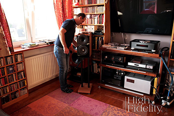 The room I work in is around 35 m2 big, 25 m2 of which is the main room, and the rest is an open corridor – so the whole has an irregular shape. More important, however, is that the walls on the side and behind the speakers host shelves full of books and CDs, so that the acoustics of the room is not very lively. On the other hand, it is not dull either, but in some cases, this amount of “acoustical treatment” can be a problem and speakers require some help. As they did in this case. We carried out the listening session with the designer with classic speakers setup, in which the rear edge of the speakers is placed about 80 cm from the back wall (there are still shelves with books and CDs in between). After we decided to implement a different setup the Atmosphere were placed only 45 cm from the wall behind them. I used the Soulution 710 power amplifier with the Ayon Audio Spheris III preamplifier to drive them. |