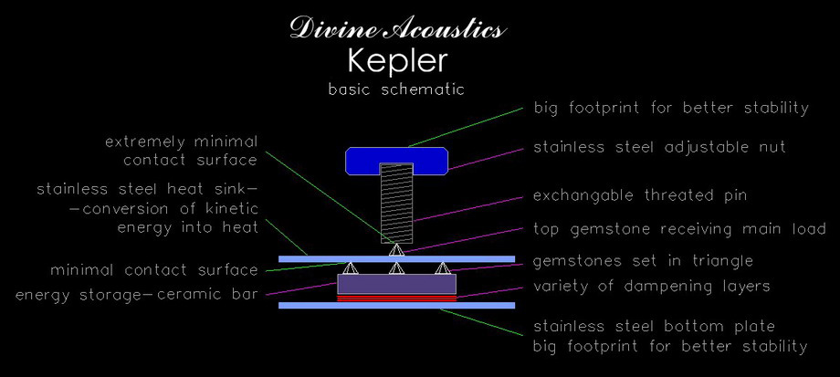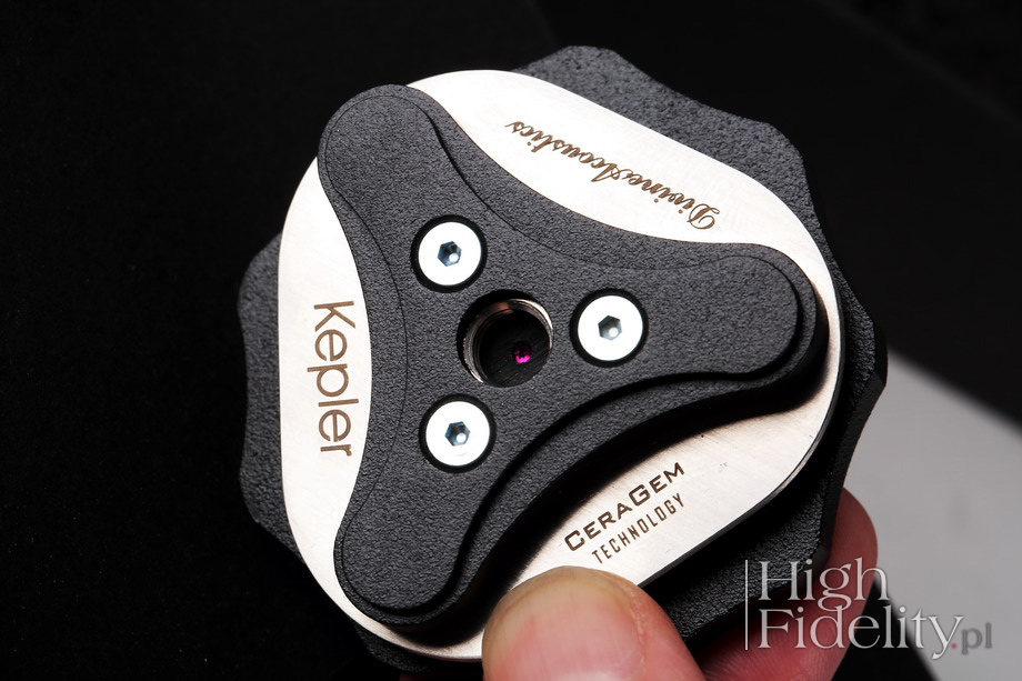 But in addition it is good if there is something else behind the product - something that enriches this company. Divine Acoustics firstly introducing the Halley, and now the Kepler anti-vibration feet will inevitably raise questions about motives. The fact that the financial thread is present here is probably clear as for the company to grow it needs to make money. In the case of Mr. Piotr Gałkowski, the owner and designer of the company, however, it goes hand in hand with the need for development. Evidence? - Let us ask ourselves what speaker cables fully implement the vision of the loudspeakers' designer, and the answer is: the same ones that are used inside speakers, that is, the best solution is to use the same wires inside loudspeakers and then from speakers terminals to amplifier. And this is the genesis of Halley cables, flat ribbons being an extension of the internal cabling of the Electra Generation 3. So let's ask a second question - what should one put the speakers on. They can be decoupled using a ball bearing. That's what Finite Elemente does, Pro Audio Bono, Franc Audio Accessories, and Stacore anti-vibration platforms work on a similar principle and also Avatar Audio. The most common choice are spikes though. This is a simple, highly effective way to reduce vibrations and for their directed extinguishing, though imperfect one. To make it work, the spike itself is not enough, it must be a whole, complex system, as in the Stillpoints feet. Or in Keplers. | KEPLER Mr. Gałkowski's solution seems to have much to do with both of these solutions, especially with the latter. But it is also so different that it is not a duplication of a technical solution of any of the aforementioned manufacturers. The Kepler feet come in nice, neat boxes with a set of three, four or eight of them. They were designed for loudspeakers, but it soon turned out that they work well under electronic devices. These two versions - the loudspeakers feet feature the "S" suffix - differ in the number of decoupling stones used, and thus the maximum load, which for the electronics version is 20 kg per foot. They look unbelievably professional, simply professional. Each feet consists of more than 40 (!) elements, and – according to the manufacturer - their main function, ie the accumulation and dissipation of vibrations, is carried out through nine layers made of various materials. In the center of the whole design lays, however, the CeraGem technology developed by Divine Acoustics. As it reads in the manufacturer's materials, it combines the advantages of hard materials: sintered ceramic, precious stones with a repeatable crystal structure and various metals. CeraGem technology is a proprietary solution of the company and does not duplicate solutions used by other companies: Inside the Kepler enclosure, a rectangular ceramic bar cooperates with precious stones arranged in the shape of a pyramid based on a non-parallel triangle. The stones are held in a fixed position, they cooperate with chromium-nickel steel and together they form a three-layer system. From the outside one can see six layers of different materials in black or steel color. The whole is bolted from below – with six screws - and from above – with three. The feet have an irregular shape resembling a knob in the machine tool. From the top you can see engraved inscriptions with: company's name, model and CeraGem technology. The feet have an outer diameter of ø 60 mm and a height (with nut) of 35 mm. The nut on the upper part of the screw is used for easier placement under the devices. The version for the speakers is screwed into the holes in the base - the standard spindle thread is M8, but on request you can get others. Keplers require a bit more work during assembly than other feet, due to the different design. The point is that when screwing in and assembling, the pin is locked with the lock nut, which later should be released. It's not difficult to do, but you have to remember the right sequence of actions. It is important that after leveling the speakers or electronics, the stem has a slight play, and it is not stiffened. The feet are offered in sets of 3 or 4 pieces with interchangeable threads as feet to be used under audio components and in sets of 8 pieces with fixed mounting threads as a replacement for screw-in speaker spikes. And one more thing - Keplers come with thin felt discs, you can put them on to avoid damaging the surface. Mr. Gałkowski says that he did not notice that they changed the sound. But it's worth trying something else, like Acoustic Revive CP-4 washers, made of piezoelectric material developed at the University of Tokyo. ![]() PIOTR GAŁKOWSKI The Kepler anti-vibration feet were created „by accident”. They were to be part of the newly designed speakers, which will soon be available. Initially, Kepler was meant to suppress the vibrations of the tweeter in a chamber specially prepared for it. During one of the listening sessions, I placed the prototype of this "silencer" as the feet under the whole speaker and that's what started the whole story ...