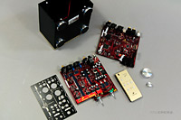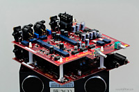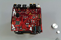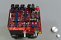 Sekcja analogowy znalazł się na osobnej płytce. Z sekcji cyfrowej przechodzimy tu przez złocone piny. Znacząca większość płytki zajęta jest przez rozbudowane układy zasilające, w tym dławiki. Serce układu to dwie, maleńkie układy scalone. Bardzo dużo miejsca zajmuje regulacja sygnału wyjściowego – przeprowadzono ją za pomocą przekaźników i drabinki rezystorów – to stąd „klikanie” przy kręceniu gałką siły głosu. Wyjścia kluczowane są kolejnymi przekaźnikami. Wzmacniacz słuchawkowy to tak naprawdę jedna, duża kostka – to scalony wzmacniacz LME49600, niskoszumny układ o niskich zniekształceniach i dużym prądzie wyjściowym z kaskodowym układem bipolarnych tranzystorów na wyjściu. Siłę głosu regulujemy w miniaturowym „samochodowym” potencjometrze Alpsa. Galka siły głosu steruje enkoderem tej samej firmy.