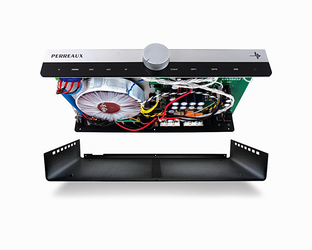 Słuchając na koniec śpiewających pań odniosłem wrażenie, że wokale z płyt CD były nieco gładsze, bardziej przekonujące, angażujące, niż te z plików odtwarzanych za pomocą wbudowanego przetwornika. Znowu trudno mówić o znaczących różnicach – gdyby nie bezpośrednie porównanie (bo tak naprawdę słuchałem tego samego materiału z płyty a zaraz potem z plików, lub w odwrotnej kolejności) to wcale nie jestem pewny, czy bym je w ogóle wychwycił. W połączeniu z Rogersami w dźwięku CD było po prostu nieco więcej „magii”, tej sprawiającej, że zupełnie nie chciało się od słuchania odrywać, a jedynie dostarczać kolejne płyty. Słuchając plików właściwie było podobnie, przynajmniej dopóki nie doszło do bezpośredniego porównania z CD – siłą rzeczy porównanie do choćby tylko nieco lepszej wersji tego samego dźwięku automatycznie uzmysławia nam, że „można jeszcze lepiej”. PodsumowanieAudiant 80i to moim zdaniem urządzenie, które w swojej cenie broniłoby się nawet gdyby było „tylko” wzmacniaczem zintegrowanym. Nowoczesny design, wystarczająca moc do napędzenia większości kolumn, równe, spójne pasmo, w którym jest i niski, dociążony bas, i pięknie skrzącą się góra, uzupełnione ciepłą (w dobrym tego słowa znaczeniu), gładką, kolorową średnicą. Może, jak pisałem, Nowozelandczyk nie jest demonem szybkości, ale to właściwie jedyne co można mu zarzucić (zważywszy na jego cenę oczywiście), o ile w ogóle można to uznać za słabość. No a przecież dostajemy, wg mnie właściwie w gratisie, dobry przetwornik cyfrowo-analogowy z kompletem wejść cyfrowych (z USB) włącznie i przedwzmacniacz gramofonowy. Wydaje mi się co prawda, że to wzmacniacz oferuje nieco wyższą klasę brzmienia, ale to wcale nie oznacza, że DAC jest słaby – ot po prostu jeśli wzmacniaczowi dostarczymy sygnał jeszcze wyższej klasy to on będzie to w stanie pokazać. Nie sprawdziłem co prawda phonostage'a, ale z opinii, które można znaleźć w sieci wynika, że jest to również dobrej klasy urządzenie dla wkładek MM i ewentualnie wysokopoziomowych MC. Kupujemy więc Audianta 80i, gramofon, kolumny, komputer pewnie w domu już jest, i mamy kompletny system dobrej klasy. Można lepiej? Oczywiście, tyle że trzeba mieć na to znacznie większy budżet. BUDOWAPerreaux Audiant 80i to pierwszy przedstawiciel nowej serii nowozelandzkiego producenta. Trzymając się klasycznej terminologii należy powiedzieć, że to tranzystorowy wzmacniacz zintegrowany, tyle że w nim zintegrowano dodatkowo przetwornik cyfrowo-analogowy oraz przedwzmacniacz gramofonowy. Zgodnie z tradycją tego producenta elementami wzmacniającymi są transformatory typu MOSFET, a urządzenie pracuje w klasie AB oddając 80 W mocy na kanał dla 8 Ω (130 W dla 4 Ω). Atrakcyjnie wyglądająca obudowę wykonano z grubego aluminium – górna połowa frontu i górny panel są srebrne, a tył i spód czarne. Dolna część frontu ma kolor czarny i jest wykonana (jak sądzę) z akrylu. Umieszczono w niej podświetlane, dotykowe sensory do obsługi podstawowych funkcji wzmacniacza. Stopień podświetlenia przycisków dotykowych jest regulowany. Front zdobi dodatkowo spora gałka regulacji głośności. Na tylnym panelu znajdziemy trzy wejścia liniowe (RCA), w tym jedno to wejście do przedwzmacniacza gramofonowego, pętlę do integracji wzmacniacza z systemem kina domowego, wyjścia analogowe pre-out i line-out, wejścia cyfrowe (2 optyczne, 1 koaksjalne, 1 USB), oraz gniazda głośnikowe. Dodatkowo, obok wejścia phono znajduje się gniazdo uziemienia. Cyfrowe wejście koaksjalne jest sprzęgane transformatorem w celu zapewnienia odpowiedniej izolacji elektrycznej, a według producenta ma to również wpływ na obniżenie jittera. Jak wspomniałem w tekście gniazda RCA co prawda pozłacane i dość solidne, umieszczono dość blisko siebie co utrudnia, a w ekstremalnych przypadka uniemożliwia stosowanie interkonektów z dużymi wtykami (jak choćby wtyki Xhadow).