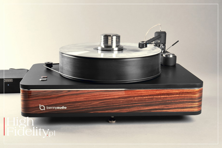 Version no. 2. – June 14th 2018. Triangular plinth made of silicone interleaved plywood. External motor of his own concept. Platter and bearing - spare parts for Rega. Photo from TF’s archive I remember it like it was yesterday - it was a Friday evening on April 26th 2019, dedicated to the YES band. I was really nervous for the whole 4 hours. In my head I saw a turntable breakdown causing the whole stage to catch fire, all the more so because the music from YES did not soothe the nerves. Fortunately, there was no failure, and the opinions of participants encouraged me to prepare a commercial version - since I already knew what and how to do, why not make turntables for other people? And here the real struggle began, because a DIY component made for oneself is something totally different than a commercial product, as I soon found out. Some time passed and in September 2019 I could finally present to the world three units of my first turntable, the T1 model. One of them regularly "goes" to Vinylhouse meetings, and the other two play from time to time during the evening events organized by the Media-Hit shop. All the meetings and opinions people shared with me resulted in introduction of several improvements and changes to the project. In March, a "civil" version was created - technically a twin, but after a slight visual facelift. Today I can say it with certainty that the BennyAudio turntable is what I dreamed about. I devoted every spare moment to it, read a lot of articles, looked through thousands of photos, spent hundreds of hours in the workshop. I made many right and some wrong decisions, and above all I significantly exceeded the budget.Would I, knowing what I do today, do it again? Sure I would :) ♦ | IMMERSION BennyAudio is particularly interesting because it offers both a turntable base or drive and a tonearm. Even such big companies as the German Transrotor, or the English Avid, for many years they did not make their own tonearms, but used ones made by other brands (Rega, SME, Jelco). The case of this Polish company is more like what we know from the history of SME, another British specialist who for a long time offered ONLY arms, and turntables came later. The difference is that BennyAudio developed both components simultaneously, before releasing any product to the market. Mr. Tomasz is a perfectionist. Such people don’t have it easy because nothing is ever good enough for them and there is always something to improve. But if they decide to introduce a finished product, we can be sure that it is of the highest quality. And the IMMERSION turntable is just that - refined in every detail. This is a completely "finished" and refined product that looks as if it was prepared by one of the big specialists - SME or Clearaudio. Drive | The tested turntable is a non-decoupled, mass-loader. Its base in the main part is made of beech plywood, hot glued under pressure and cut out with a water jet. The upper part is reinforced with 3 mm thick stainless steel, covered with a 2 mm layer of vibration damping micro-rubber. The base is closed from above and below, also with 10 mm thick aluminum cut. The sides are veneered and varnished, and the top and bottom are black anodized. A large, solid platter catches the eye. It is hand-rolled from a material called polyacetal C (POM-C). It is a thermoplastic material with high mechanical strength and high heat resistance. Because it has good anti-friction and mechanical properties - internal damping - it is often used in audio applications. We’ve seen it in products of such companies as: Transrotor, Dr. Feickert Analogue, Holbo and others. The platter in the tested turntable is massive and solid - it is 65 mm thick. The hydrodynamic, inverted bearing on which the platter spins was constructed by Mr. Tomasz. The tungsten carbide ball provides support between two elements - a steel, hardened stem and a Teflon washer. The torque is transferred from a pulley mounted on the axis of the engine, that is made according to his own design in one of the Chinese companies. There are three recesses on the circumference of the pulley. They allow user to easily set the height of the belt. Motor | The motor is mounted in the base and carefully separated from it using Sorbotane. As Mr. Tomasz said, this is not one of many popular turntable motors, and the meaning is it’s a more robust and "quieter", brush-less, industrial DC motor with considerable torque. It is powered by a cascade control system, with several circuits that "supervise" each other. Speed fine-tuning automatically occurs every few revolutions with an accuracy of 12 bits (4096 accuracy positions, which corresponds to a voltage change of 0.8 mV). A digital reflection sensor and driver with proprietary software were used for this purpose. The optical tracking system was located in the base, under the platter, and the tape was placed on the platter itself. Switching between 33.33 and 45 r.p.m. speeds is executed with a push of a button. One turns on the rotation with one button and changes it with the other - both are highlighted. I only wish a different backlight color would differentiate 45 rpm. Start and stop are smooth and easy - the control has been programmed so that the belt is subjected the the least force possible. The motor is powered by an external, regulated 24 V DC power supply. The set includes a very good PS made by the Polish company Tomanek.