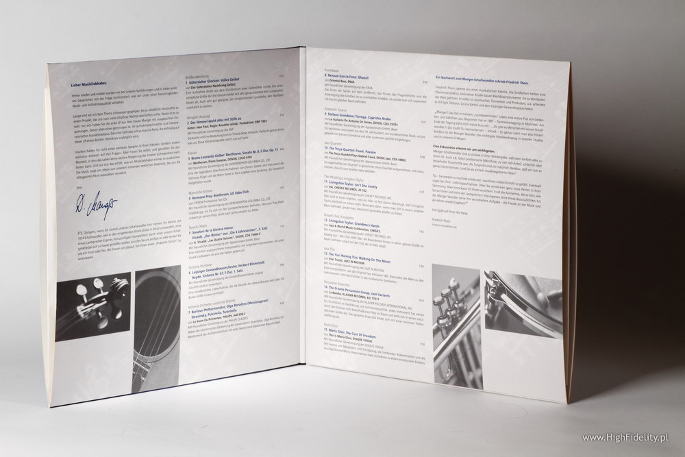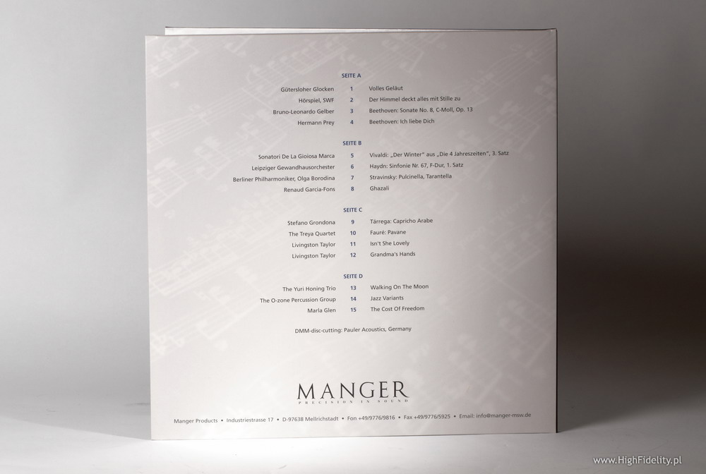 |   Program: Po trwających przez 30 lat badaniach Josef W. Manger opatentował Manger Sound Transducer, wyjątkowy przetwornik, pokrywający niemal całe pasmo przenoszenia, pozbawiony klasycznej membrany. Dzisiaj firma Manger prowadzona jest przez jego córkę, Danielę Manger, z którą miałem okazję porozmawiać podczas tegorocznej wystawy High End 2010. Płyta została na nowo przygotowana w studiu Pauler Acoustics przez Güntera Paulera i nacięta została w jego ulubionej technologii Direct Metal Master (o niej TUTAJ). Nagranie zostało przygotowane bez żadnej kompresji, zachowując ponad 50 dB dynamikę. Dodam, że cyfrowa wersja (CD) tego samplera przez wiele lat służyła mi jako punkt orientacyjny przy niemal wszystkich testach.ODSŁUCH Chciałbym jedno powiedzieć zaraz na początku: słuchany teraz, na najlepszych dostępnych mi urządzeniach sampler Mangera w wersji CD wciąż zaskakuje fantastycznym brzmieniem i umiejętnym doborem repertuaru. Można go po prostu słuchać, jak każdej innej płyty. Nie chcę, żeby recenzja ta była odebrana jako zero-jedynkowa, bo tak nie jest – nie jest tak, że nowsze automatycznie grzebie to starsze, tylko dlatego, że jest nowsze, że zastosowano przy nim magiczne składniki itp. To tutaj słychać, że jeśli coś było dobrze zrobione, to będzie dobre i za dziesięć lat, i więcej. Tym bardziej, że technika cyfrowa, szczególnie z tej najwyższej półki, jest zupełnie gdzie indziej niż wtedy, kiedy słuchaliśmy tego samplera po raz pierwszy. To w jej przypadku wiadomo, że postęp jest wyraźny, że jeśli coś dobrze cyfrowo zakodujemy, to będziemy mogli to coraz lepiej dekodować. Ach, jak pięknie zabrzmiały Ich Liebe Dich Beethovena, a zaraz potem Der Winter Vivaldiego! Potęga, dynamika, czystość itp. A przecież wciąż mówię o wersji CD… Mimo wszystkich tych zachwytów nie da się ukryć, że wciąż cyfra to nie jest to samo, co analog. Jeślibym słuchał wersji CD w oderwaniu od winylu, to powiedziałbym, że to jest referencja. Analogowa wersja tego samplera wnosi jednak do tego coś więcej – głębsze brzmienie, aksamitniejsze tło, dźwięczniejsze uderzenie. Różnice może nie są powalające i nawet grając LP na topowych systemach trudno nie docenić kunsztu ludzi, którzy zarejestrowali te utwory, a potem je przenieśli na CD. A kiedy to zrobimy, kiedy uchylimy przed nimi czapkę, jeszcze niżej trzeba się będzie pokłonić przed ludźmi, którzy tę wersję przygotowali i przed Pauler Acoustics, gdzie – w procesie DMM – nacięto master. To głębokie i piekielnie dynamiczne granie. Na pierwszy rzut oka wydaje się nieco cichsze niż CD, ale najwyraźniej całość jest nieco cichsza, żeby lepiej pomieścić skoki dynamiki. Wszystko aż kipi harmonicznymi, jest koherentne i spójne. Znakomite!Jakość dźwięku: Referencja Reedycja: Referencja |           |