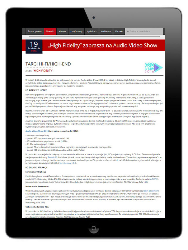 JUŻ NIEDŁUGO AUDIO VIDEO SHOW 2016 ![]() Termin: 4-6.11.2016 ![]() PO PIERWSZE: „HIGH FIDELITY”
