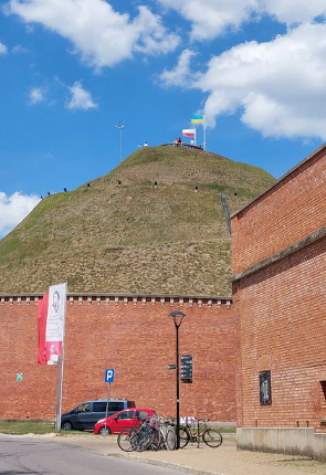 ⸜ A whole range of flags on the Kościuszko Mound in Krakow. Polish and Ukrainian flags are fluttering at the top, and a repeated Polish flag and the flag of the Mound are placed below