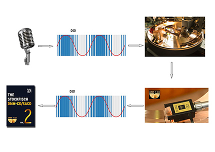 Process starts with cutting DMM disc from digital files (an analogue signal could also be used). Disc is cut at 45 r.p.m. speed, using only this part of disc's surface with zero degree tracking error. This means that material for a single SACD album has to be cut onto few such masters. Next signal is read from master using EMT TSD-15 (a special version of legendary Broadcast TONDOSE TSD-15 cartridge) mounted on EMT 997 tonearm. In this particular case the Neumann VMS-82 cutting machine acts also as a “turntable”. Signal from cartridge is sent to the tube phonostage, EMT JPA66. A Neumann correction curve that cuts off the signal below 20 Hz is applied. Then analogue signal from phonostage is sent to Meitner EMM Labs adc 8 MK IV A/D Converter. It is a reference device that converts signal to a 1-bit Direct Stream Digital format. A DSD signal of 2,8224 MHz sampling frequency is then recorded using SADiE DSD8 mastering system. Exactly the same signal can be found on SACD release. A simplified version of the process looks like that: DOUBTS There are some doubts concerning this process. First of all signal is converted twice between domains – first from digital to analogue and later from analogue back to digital. What's more: signal is cut to the disc using lathe cutter and then the signal must be read by stylus, so a linear signal must be converted using RIAA correction curve, and then the process has to be reversed. This process purposely introduces distortion to the signal. Not only that but these are also distortions of different types intended to make SACD and CD sound more like analogue medium. In late 1990ties Bob Carver had a similar idea in regard of RIAA curve. He assumed that it introduced positive changes to the sound. He build the Sunfire Classic Vacuum Tube Control Center but the product did not succeed at the time. Stockfisch used this idea additionally introducing a double conversion to the process. The first volume of the DMM-CD/SACD sampler offered an interesting performance, but in my opinion the sound was bit too harsh. Also when listening to it I heard some pops. So for me it was rather a curiosity and not a new promising way to improve sound quality of CD and SACD mediums. In Chine some more albums using this technology were released, and on February the 19th 2016 the Volume 2 of this sampler was released.