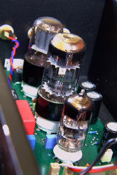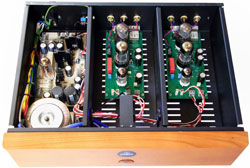 Urządzenie Edgara jest pięknie zbudowane. Obudowa to duże chassis z grubej stalowej blachy i drewnianej, ładnie wykończonej czołówki (o grubości 2,5 cm), gdzie widać duży wyłącznik sieciowy i podświetlane na niebiesko logo firmy. Górna ścianka jest w całości ażurowa, a to dlatego, że lamp w środku nie brakuje i ich ciepło musi się gdzieś podziać. Wnętrze podzielono na trzy części grubymi ekranami, które dodatkowo usztywniają konstrukcję. W jednej przegrodzie umieszczono zasilacz, a w dwóch pozostałych osobne płytki prawego i lewego kanału. Taki układ odbija zresztą wygląd tylnej ścianki, z ładnymi gniazdami RCA i dwoma wejściami - osobno dla wkładek MM i MC. Trzeba zaznaczyć, że wejścia są dość daleko od siebie i jeśli interkonekt jest wykonany w postaci pojedynczego biegu, mogą być kłopoty z sięgnięciem do gniazd obydwu kanałów. Co gorsza, zacisk uziemiający umieszczono nie - jak by to wynikało z logiki - pośrodku, pomiędzy wejściami, ale skrajnie z lewej strony. Zasilacz zbudowano przy użyciu dużego transformatora toroidalnego i lampowego prostownika dla sekcji anodowej. Pracuje tu lampa EZ 81 JJ. Wspomagają ją kondensatory o średniej pojemności. Z trafa wychodzi też osobne uzwojenie dla sterowania (po włączeniu Edgara, przez jakiś czas miga logo na przedniej ściance - to napięcie andodowe załączane jest z opóźnieniem, wydłużając dzięki temu żywotność lamp) i żarzenia. Stabilizacja napięcia dla tych dwóch ostatnich wykonana została na stabilizatorach scalonych. Płytki z układami wzmacniającymi wykonane zostały na bardzo wysokiej jakości PCB. Elementami wzmacniającymi są trzy lampy (na kanał) - dwie oktalowe i jedna miniaturowa: na wejściu 6SL7 (rosyjska lampa 6H9C Sovteka (właściwie Reflectora, bo nosi jeszcze rosyjskie oznaczenia i logo), potem 6SN7 Electro-Harmonics i wreszcie, na wyjściu 6922 ponownie Electro-Harmonics. Oporniki są niewielkie, ale metalizowane i precyzyjne (1%). Kondensatory to polipropyleny, w tym Philipsy MKT i duże Wimy na wyjściu. Układ korekcyjny jest podzielony na dwie części - pierwsza jest pomiędzy lampami oktalowymi, a druga pomiędzy 6SN7 i 6922. Pomiędzy wejściami MM i MC przełącza się za pomocą małego przełącznika hebelkowego aktywującego przekaźniki. Wejście MM można ustawić z pięcioma wartościami pojemności - 22 pF, 100 pF, 220 pF, 470 pF i 1000 pF, zaś MC z trzema poziomami wzmocnienia - 54 dB, 60 dB i 66 dB, wszystkie z innymi impedancjami wejściowymi (400 Ω, 100 Ω i 25 Ω), a to dlatego, że na wejściu zastosowano (znakomite) transfromatory wejściowe Lundahla LL9206 . Szkoda tylko, że pojemności przy MM to zwykłe kondensatory ceramiczne. Wydaje się też, że wzmocnienie układu, jako całości jest ociupinkę zbyt niskie. Przełączanie między nastawami odbywa się za pomocą złoconych pinów na tylnej ściance i jest dość niewygodne.