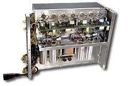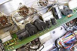 Wnętrze pokazuje mieszankę starych technik montażu z kilkoma nowoczesnymi elementami. Układ przedwzmacniacza zmontowano na wysokiej jakości, bardzo grubej płytce drukowanej z włókna szklanego. Z podstawek biegną do niej dość ordynarnie wyglądające kable, wpinane do układu za pomocą gniazd (!). W układzie widać bardzo dobre kondensatory polipropylenowe STK i metalizowane oporniki. Ciekawie wygląda sprawa wejścia - najwyraźniej do płytki wchodzi sygnał zbalansowany (6 przewodów), jednak do lampy wejściowej wchodzą tylko cztery (poprzez kondensatory sprzęgające). Być może więc, że sygnał z wejść XLR jest od początku do końca zbalansowany (?). Elementy wzmacniacza końcowego przylutowano bezpośrednio do wyprowadzeń podstawek. Bardzo ładne jest zasilanie - z dławikiem w otoczeniu czterech, bardzo dużych kondensatorów amerykańskiej firmy Mallory (4 x 100+100 µF) - obecnie należącej do Vishay.
